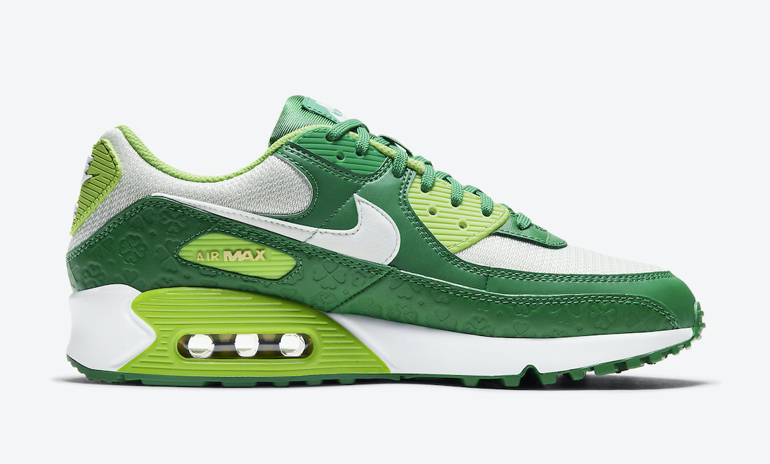 On the Air Max 90 we see a light grey mesh toe box and ankle. The midsole is white and there are matching Swooshes on each side. A light shade of green accents the shoe while a darker green makes up the majority of the shoe including the mudguard that is detailed with four-leaf clover imprints. Gold accents are on the lace aglets, the Air Max logo, and the insole logo.