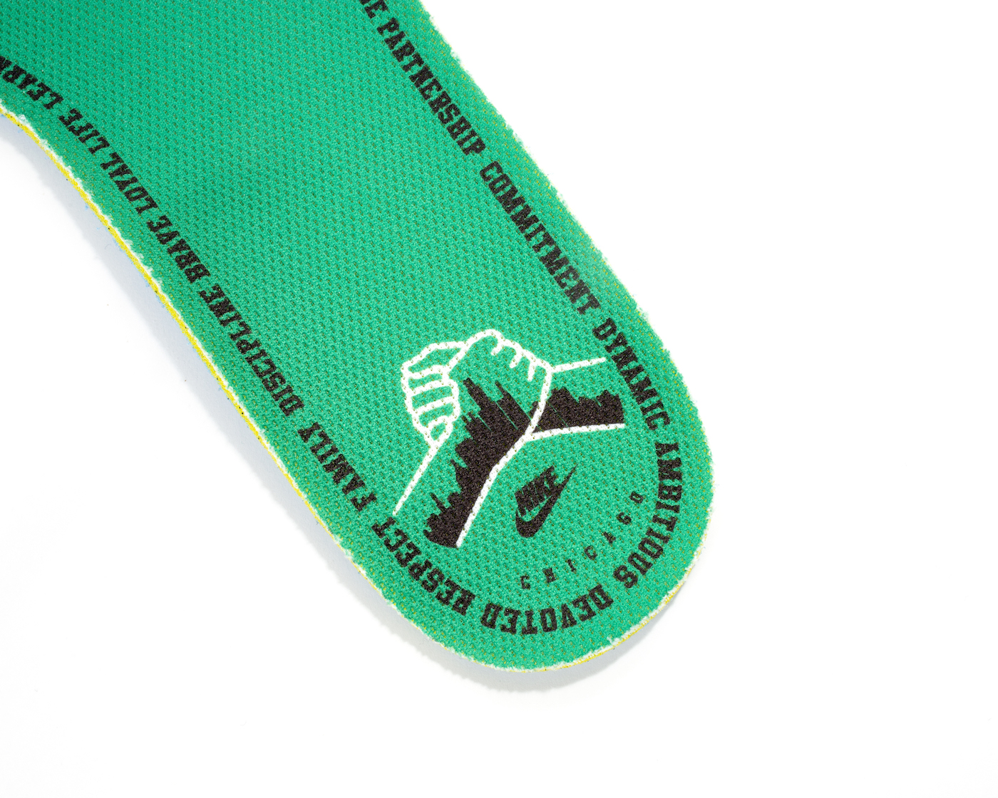 The final touch is a green insole, added as a symbol of Drew’s first barber chair when he first opened up his shop – an egg-white chair with green accents. Around the insert, Drew added words that represent the values most important to him, Chicago, and the barbershop community. The insert graphic of two hands together represents Chicago unity. Functionally, it also provides extra cushioning to support barbershops and hair stylists that are on their feet for long periods of time.