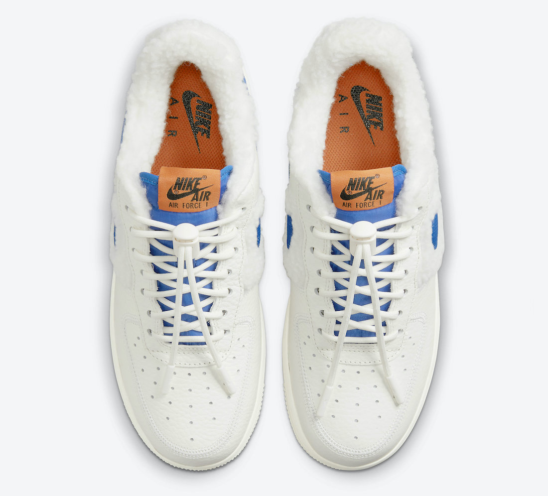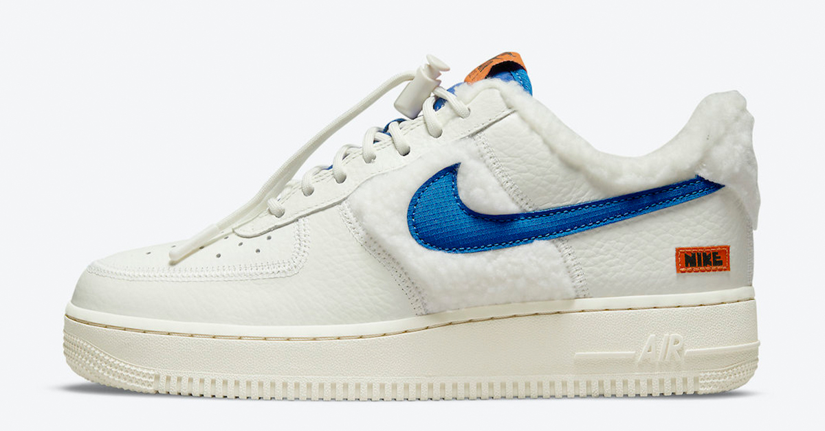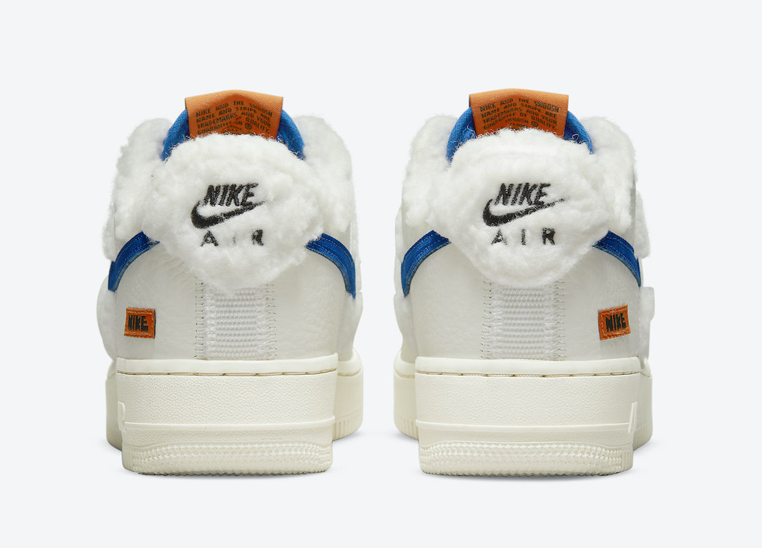 This Air Force 1 features an upper predominantly constructed of white leather, save for the quarter and heel panels that have been swapped out for puffy white fleece. Like on the AJ1 Low, the sherpa fleece material is also found on the sock liner and is exposed on the top rim of the collar. The Swoosh is made from a ripstop material and comes in blue, matching the shoe’s nylon tongue. Hits of orange are also present, found on the tongue tag, insoles, and a small Nike patch that’s stitched onto the lateral heel. Rounding out the design is white toggle laces and an all-white cupsole.
