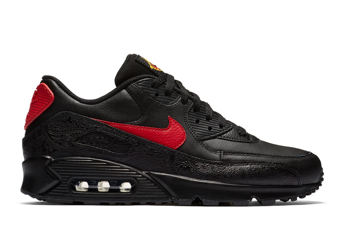 Nike Sportswear will be launching a plethora of silhouettes for the upcoming Chinese New Year festivities, that includes the Air Max 90. Seen here is the upcoming CNY AM 90 release set to drop sometime in February. The model features a black upper alongside embossed patterns on the mudguard, red hits on the heels and side panels with a tongue finish equipped with patterns on the tongue. The Air Max 90 is one of a handful of silhouettes set to release this Feb.