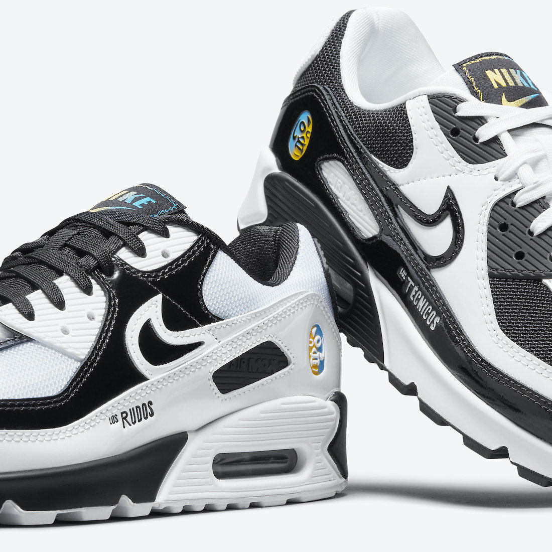 The patent and white tumbled leather are reversed on each shoe, replicating popping colors like a luchadors costume. Black and white mesh is alternated on each toe box like the leather materials. On the right sneaker, the phrase los técnicos (good guys aka “faces”) is engraved in the patent leather upper while the left shoe feature the phrase los rudos (bad guys aka “heels”). A blue and yellow luchador mask is placed on the lateral heel, with matching gradient Nike Air patch on each tongue. The insoles also get the gradient treatment and feature “¡Lucha Libre!” branding.