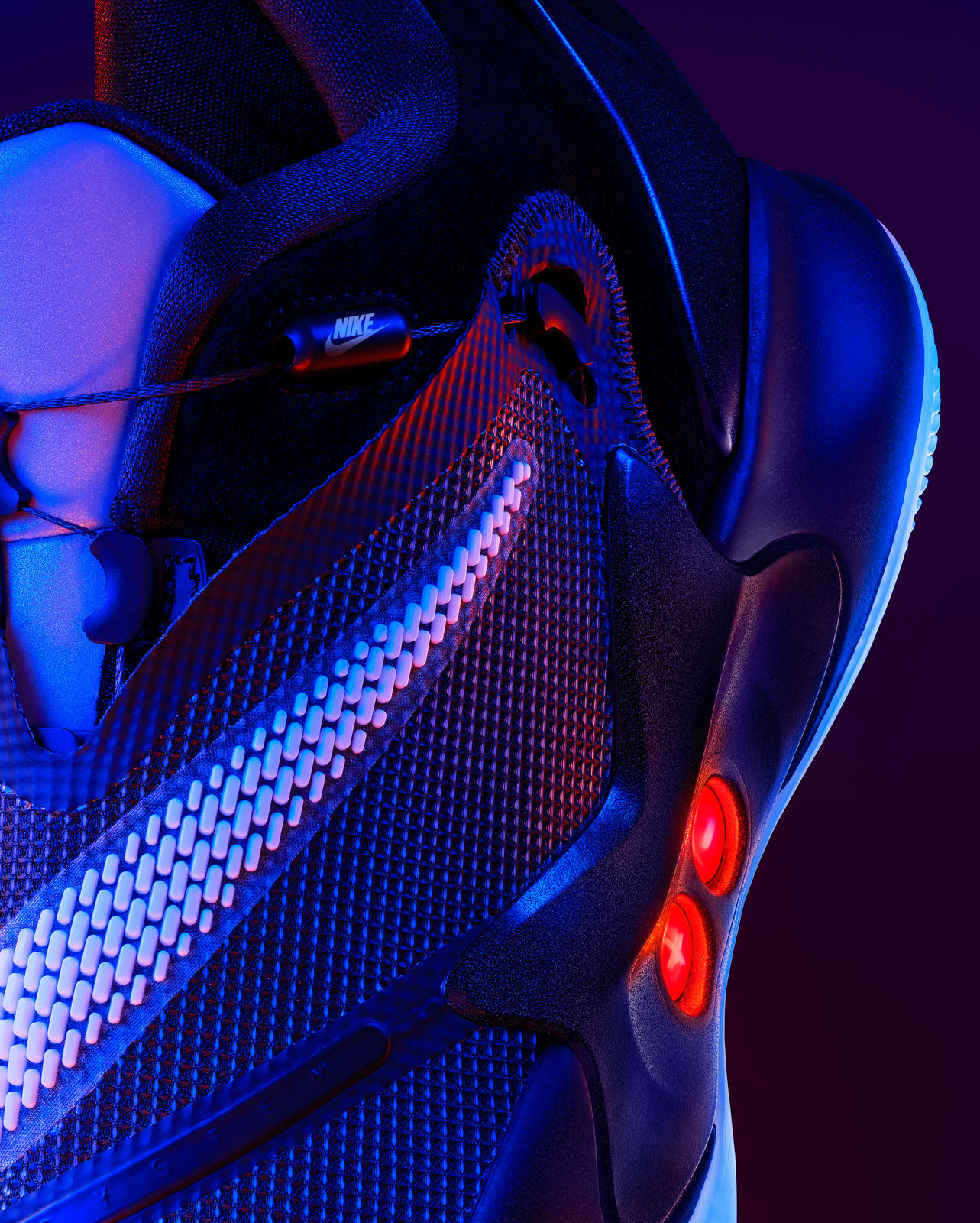 Visually, the Adapt BB 2.0 features a larger Swoosh on the forefoot and a mix of pixelated textures on the upper. The lateral clip on the midsole where the buttons are located has been given a concave geometry, adding more surface area for the lights to reflect onto.