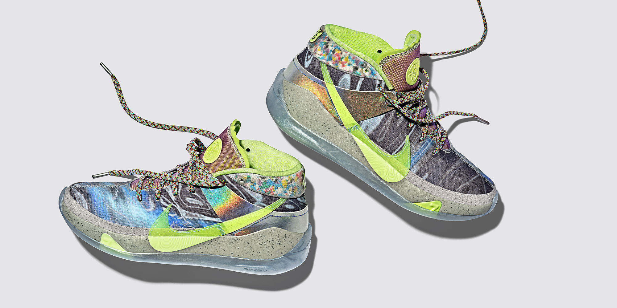 For Kevin Durant’s offering of the Nike KD 13, the design delivers an appropriate ode to future-aiding clean electric energy. The shoe boasts a plethora of elements, including silver, blue and white muted marbled iridescence, lime green Swooshes and inner lining, multicolored heels, speckled midsoles, and translucent outsoles. The platinum, silver and blue connect with KD’s power during game time and the planet’s power of tomorrow. Available March 7th on Nike.com and select retailers.