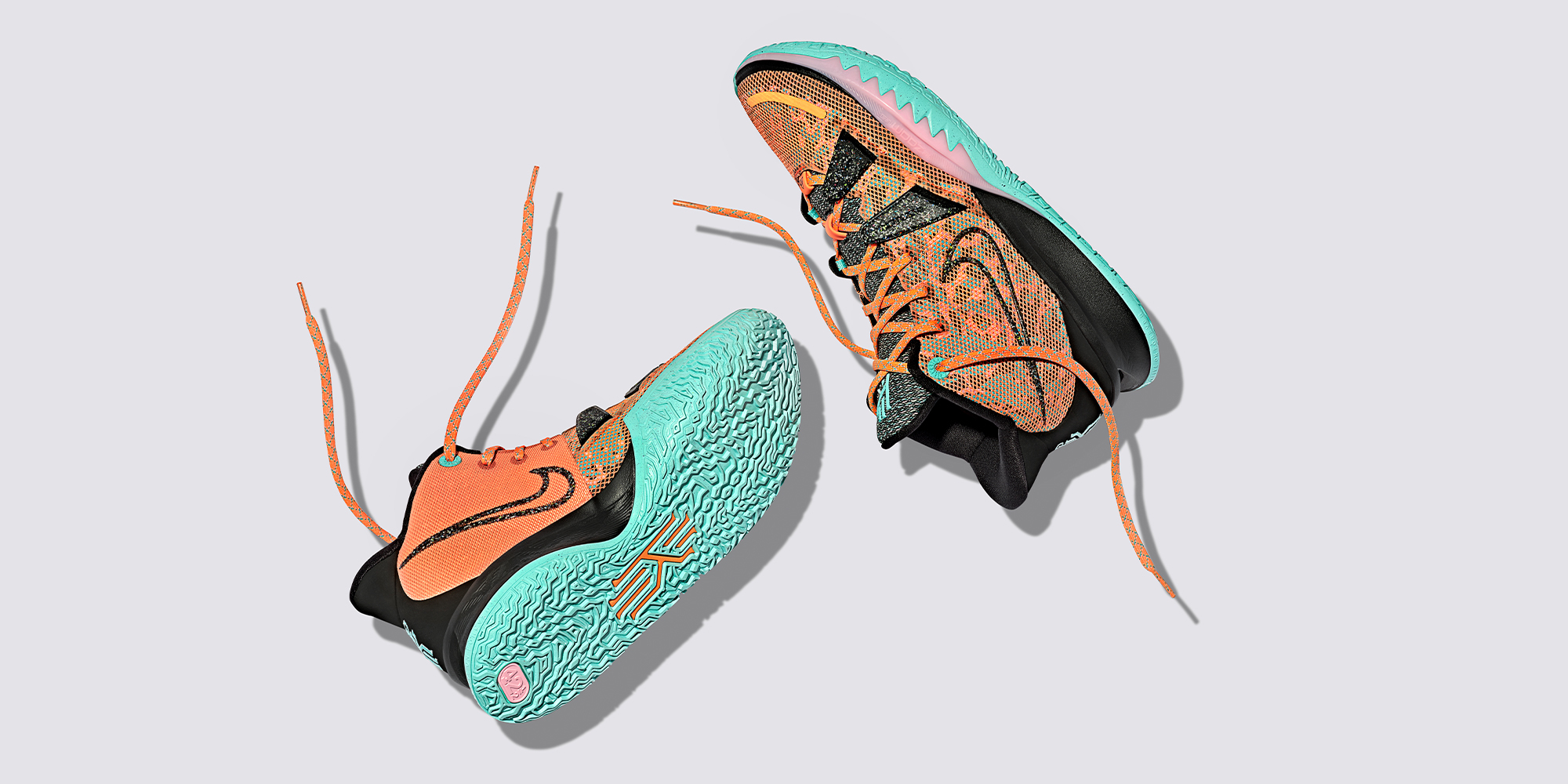 This Nike Kyrie 7 praises Irving’s plant-based lifestyle with abstract graphics on the orange upper, caged by netted layers, held together with a black heel meeting the pink midsole and teal outsole. The forefoot and Swooshes contain Regrind pieces. A “KI” logo on the heel sprouts flower petals and the individual tongue branding meshes Kyrie’s logo and an “ASW.” Available March 7th on Nike.com and select retailers.