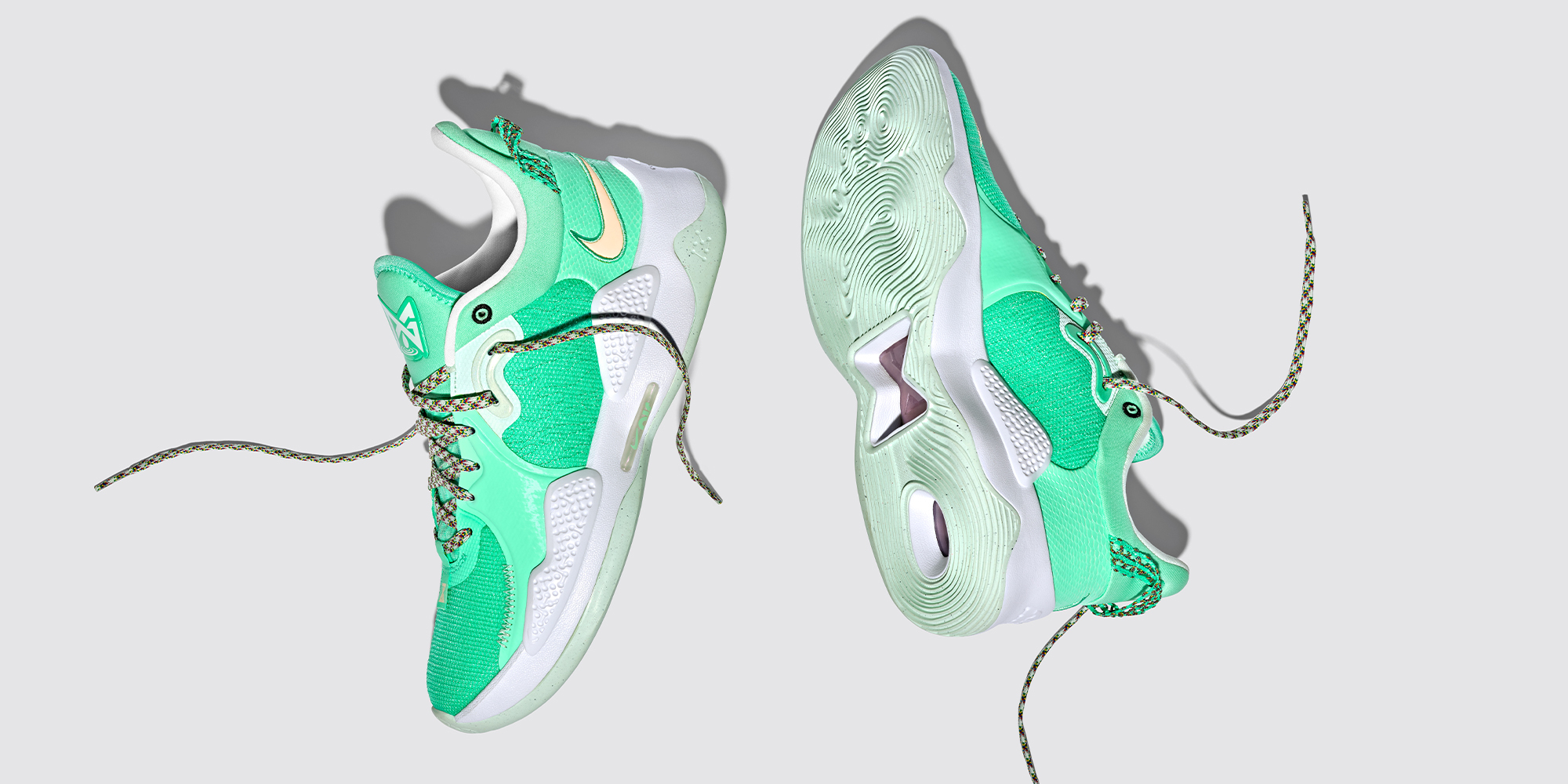 Paul George’s Nike PG 5 in this pack reflects the athlete’s love for fishing, natural landscapes and passion for making a “positive impact and protect[ing] our planet’s most precious resource.” With a cool and minty green color palette dress the highly breathable mesh uppers while the textured overlays protect the forefoot and heels. The lateral mimics ripples in the water while the Swooshes match the accents in the multicolored laces and heel tabs. The muted green outsole also has smooth water-like ridges to keep in-theme. Available March 7th on Nike.com and select retailers.