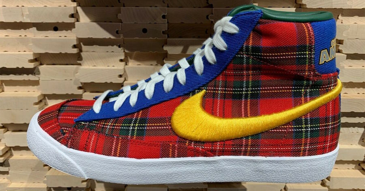 Just like the Zoom Freak 1, this Blazer Mid is dressed in a red plaid inspired by Eddie Murphy’s uniform while working at Mcdowell’s in the 1988 film Coming To America. The shoe also feature yellow embroidered Swooshes on the sides panels and blue canvas on the eyestay and heels. The sockliner is constructed from a green leather “Coming to America” branding is printed on the heels.