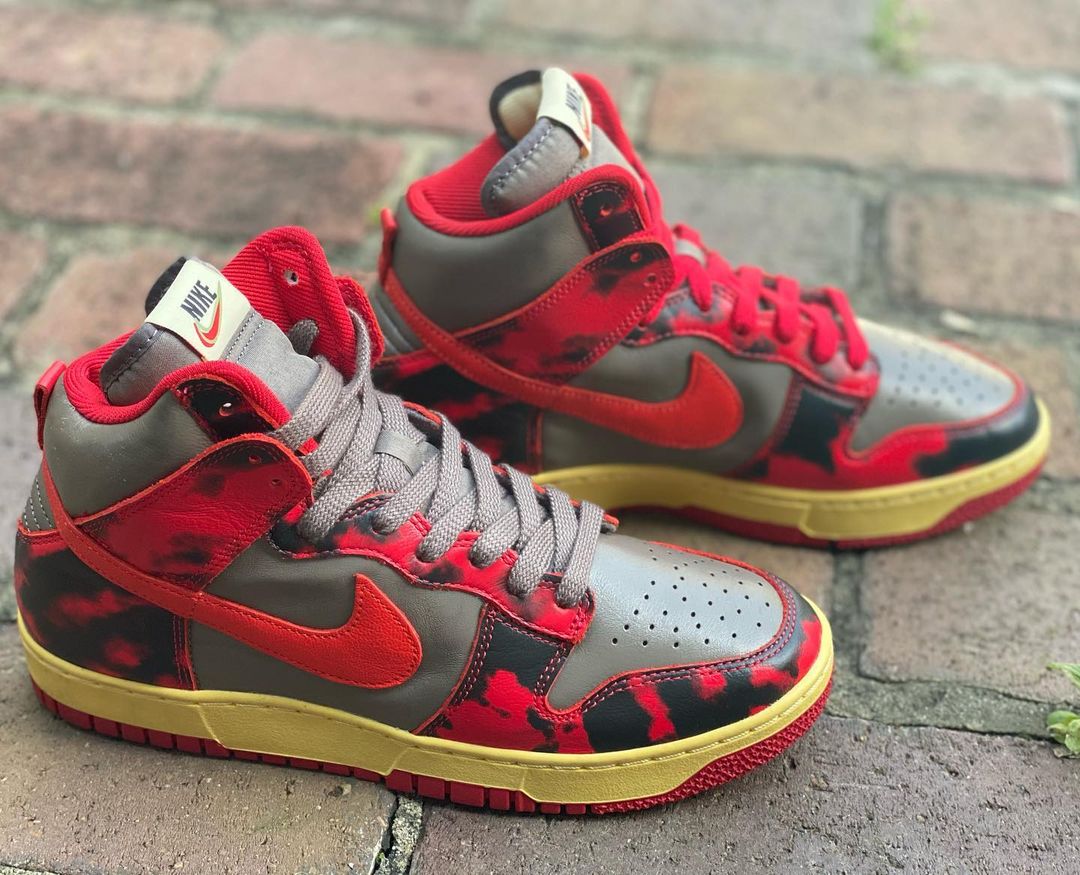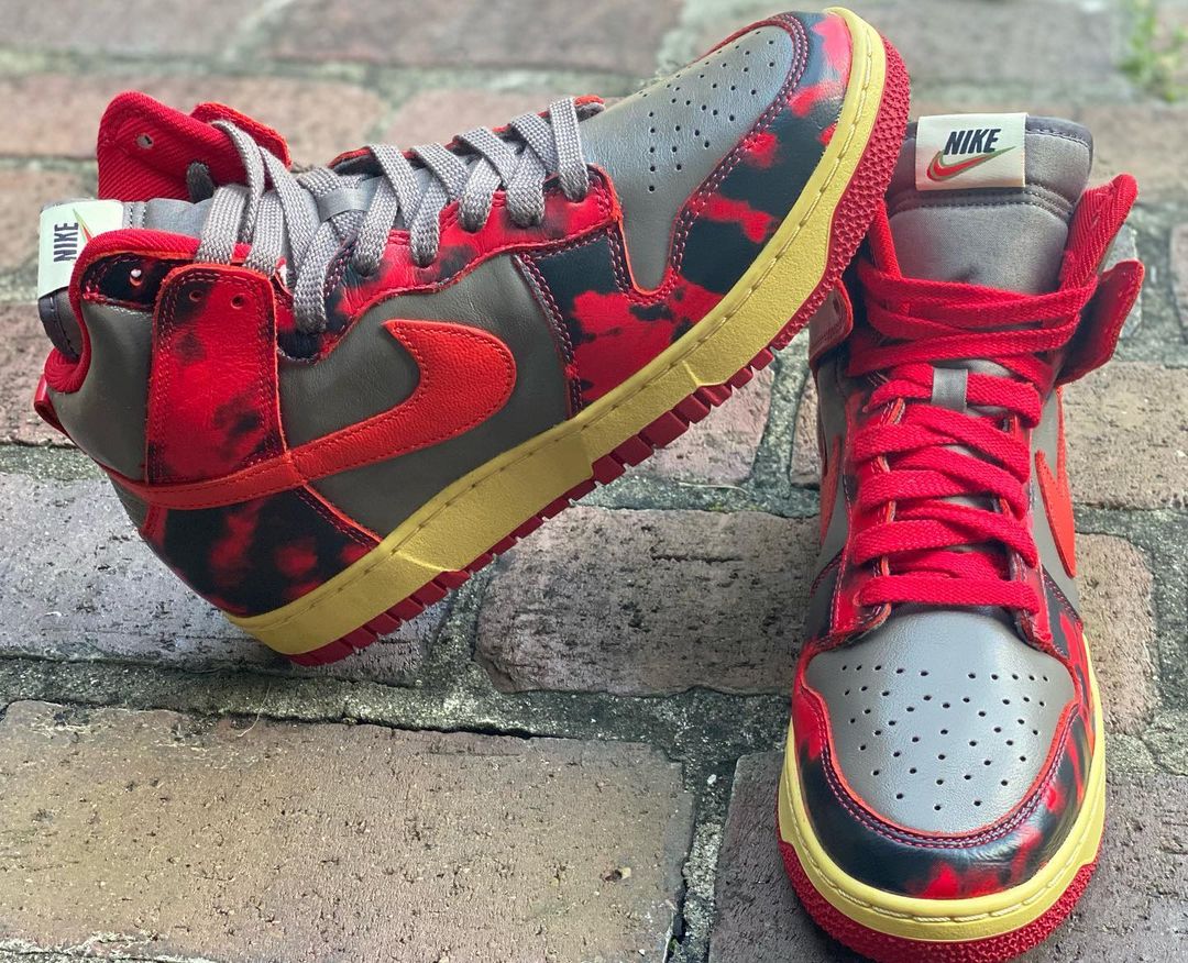 This Dunk High comes in a grey and red color scheme that is reminiscent of the OG “UNLV” colorway, though the red on the overlays are mixed with black to create a cloud-like camo pattern. The silhouette’s shape has been modified with a slight taller ankle collar, possibly to more closely resemble the OG 1985 Dunks, and the midsole has been yellowed to give off a vintage feel. Also to note is the Swoosh on the tongue tag, which comes in red but also features an outlined Swoosh with a slightly different shape, possibly a nod to the Swoosh’s evolution over the years.