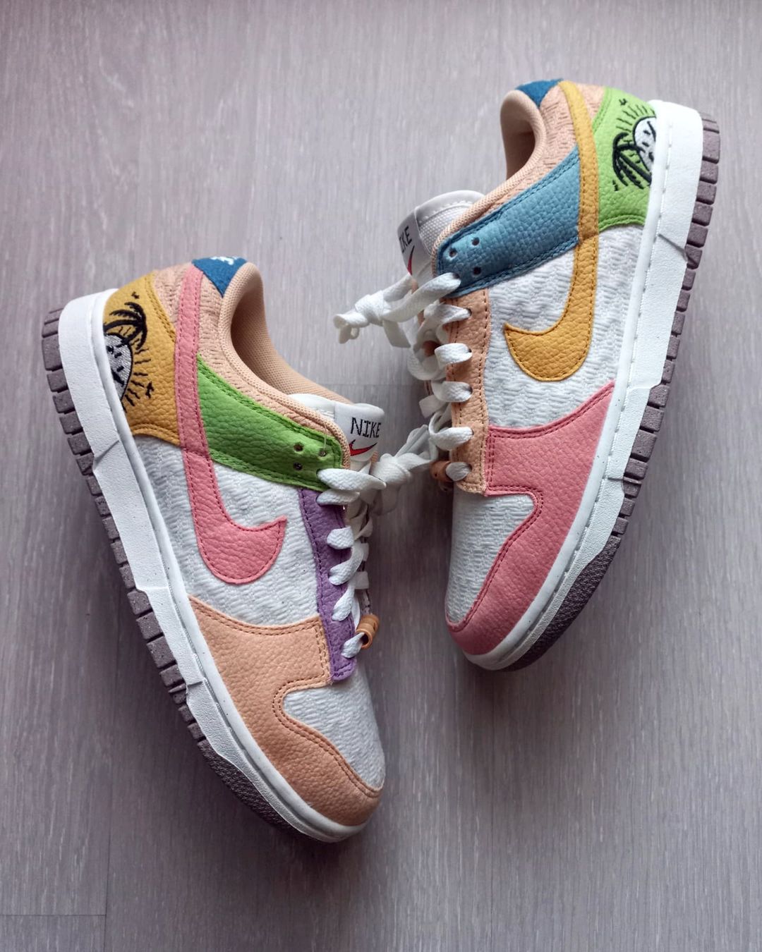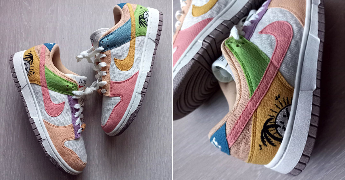 This Dunk Low comes dressed in a textured woven material, white on the quarter panels and toe box and in a peachy beige hue around the ankle. Overlays feature a tumbled leather construction colorblocked with various pastel hues that include blue, green, yellow, pink, peach, and purple. The graphic on the lateral heel depicts a tropical paradise with a palm tree and sun, the latter featuring a smiley face with a Swoosh mouth, a motif associated with Nike’s “Have A Nike Day” branding. Rounding out the design is a white midsole and a grey rubber outsole with recycled Nike Grind specks.