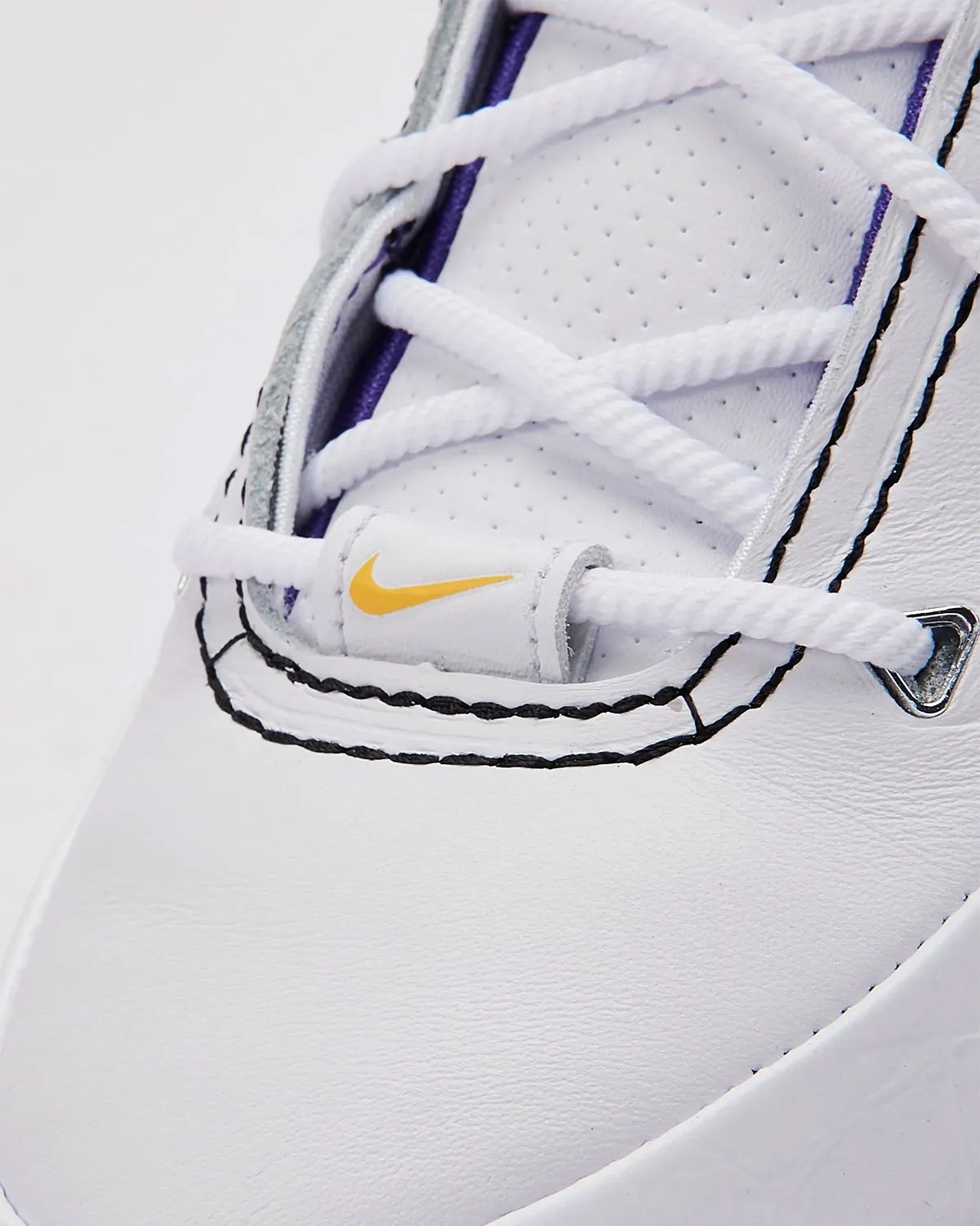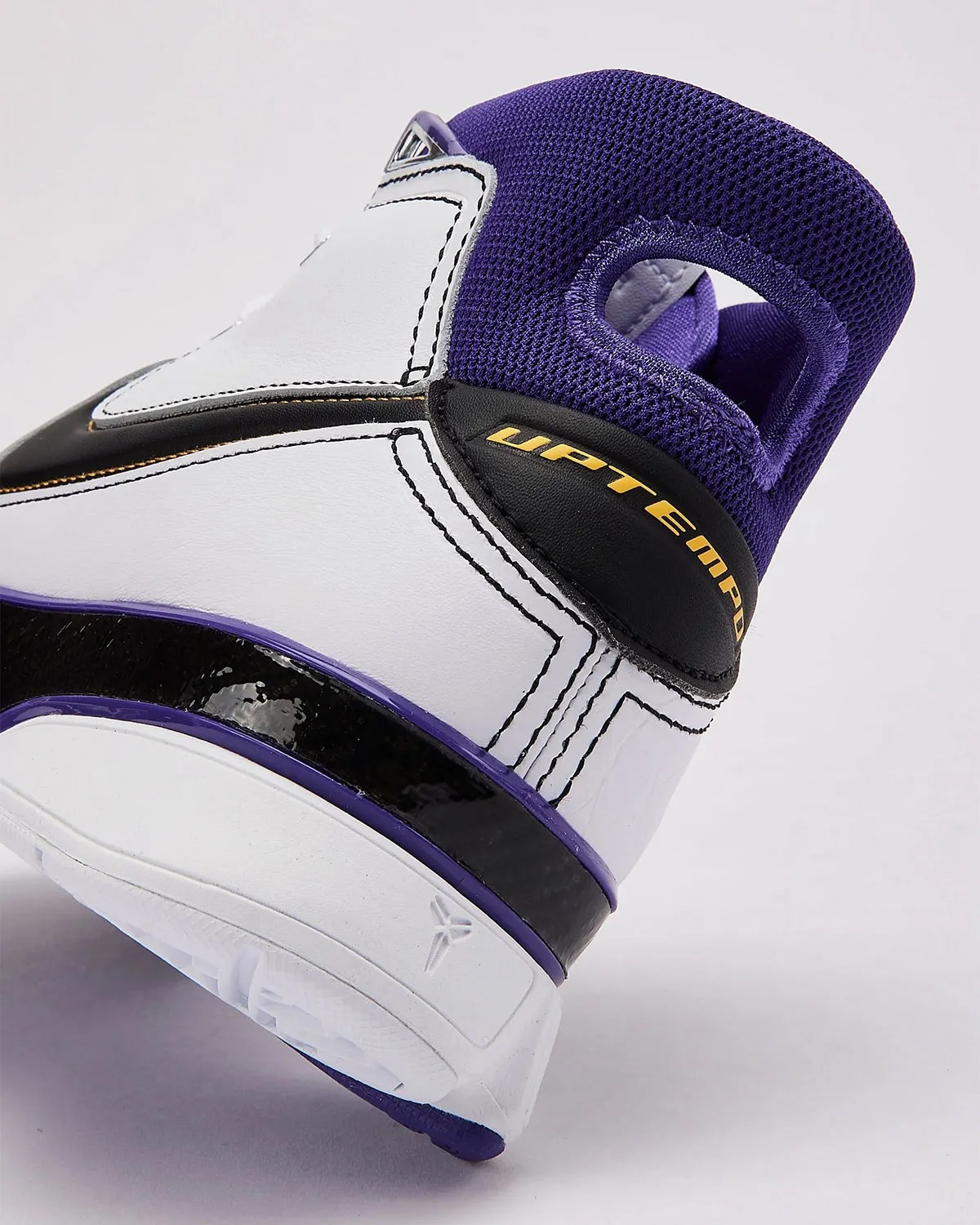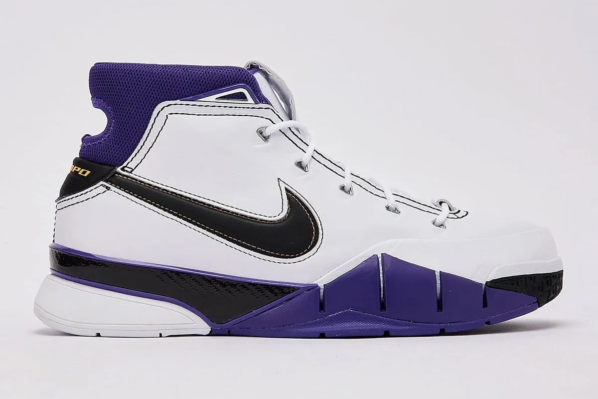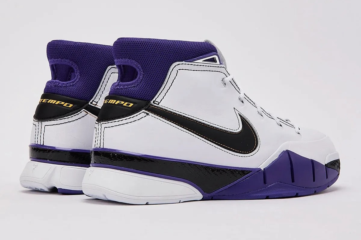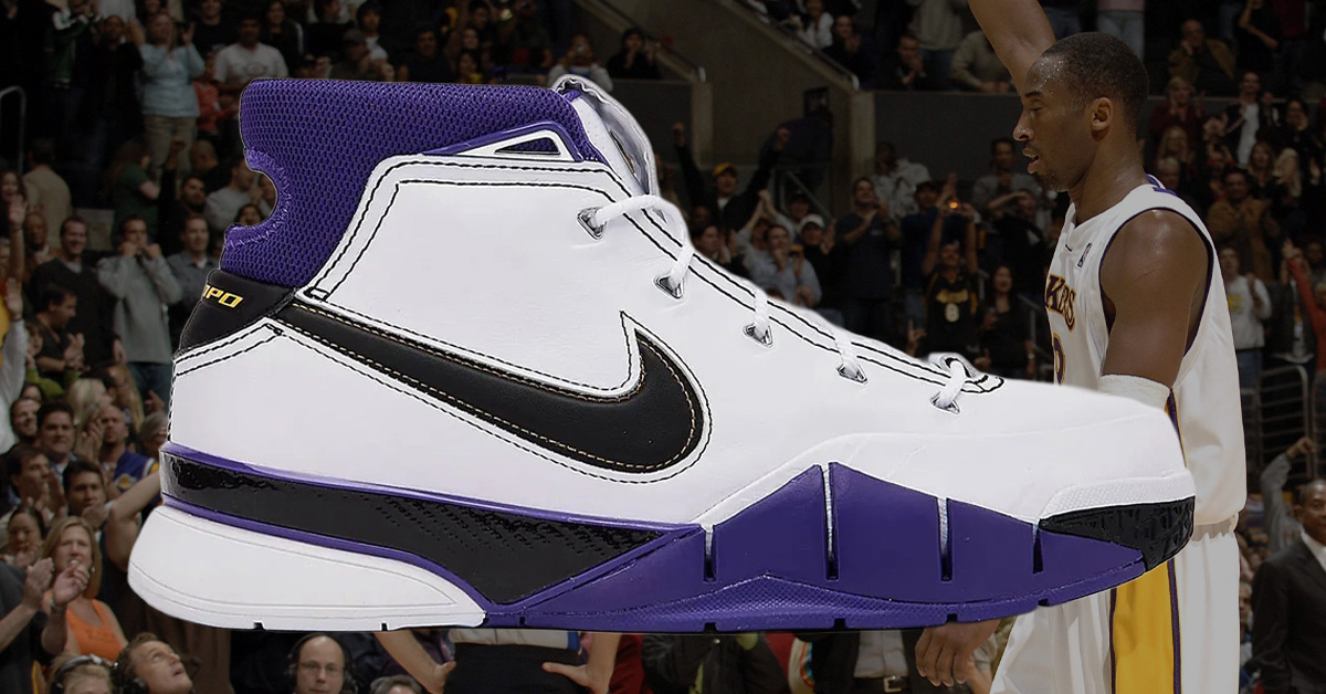 During the game, Kobe wore a PE colorway of his first signature shoe with Nike, the Zoom Kobe 1, dressed in a primarily white “Lakers Home” color scheme with black, purple, and gold accents. A limited public release for the shoe came a year later, followed by its first Protro release in 2019.