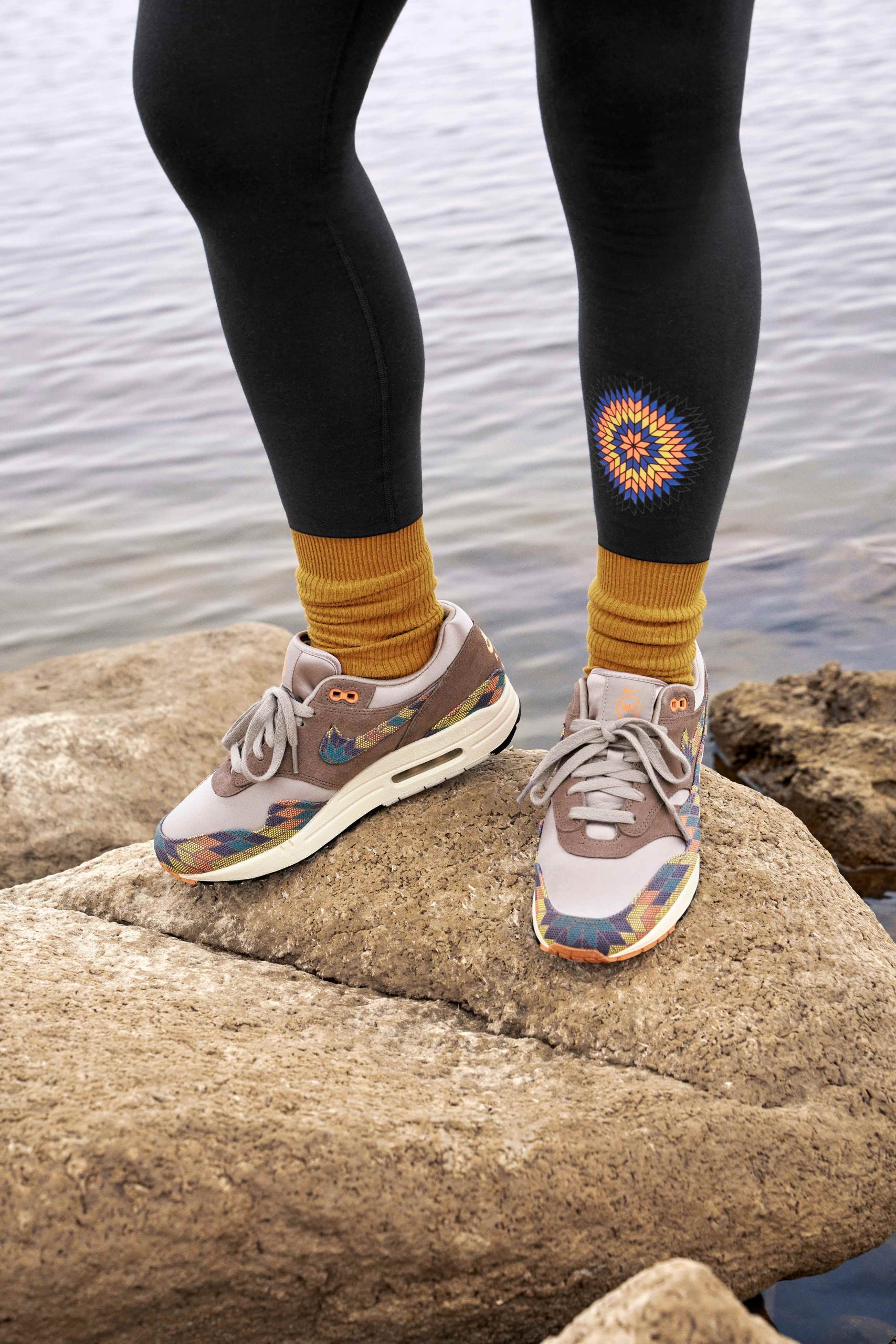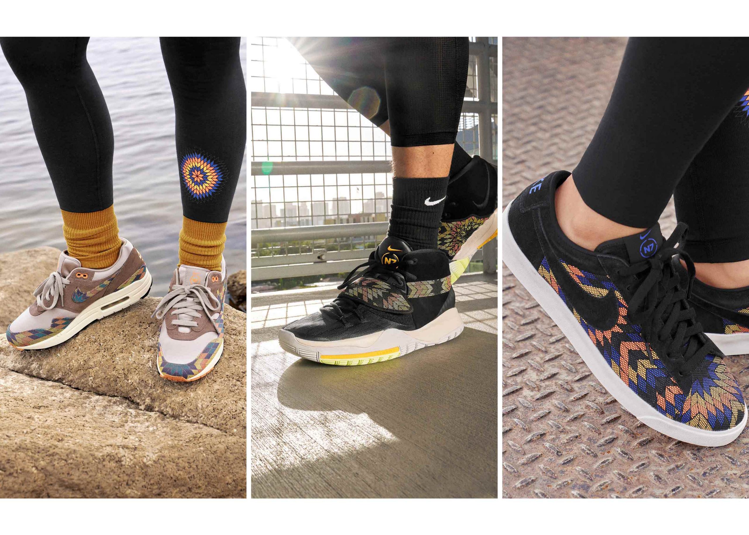 The patterns take over the Air Max 1, SB Blazer Low GT and the Kyrie 6 (available now). The colored patterns find a home on the new Nike N7 apparel including hoodies, long and short sleeve T-shirts, and leggings. The core principle of the collection is a belief in reclamation of heritage, leading athletes to become more in tune with their histories. For Irving, the journey drove him to advocate a better future for Standing Rock and Indigenous communities through activism and the Nike N7 collection.