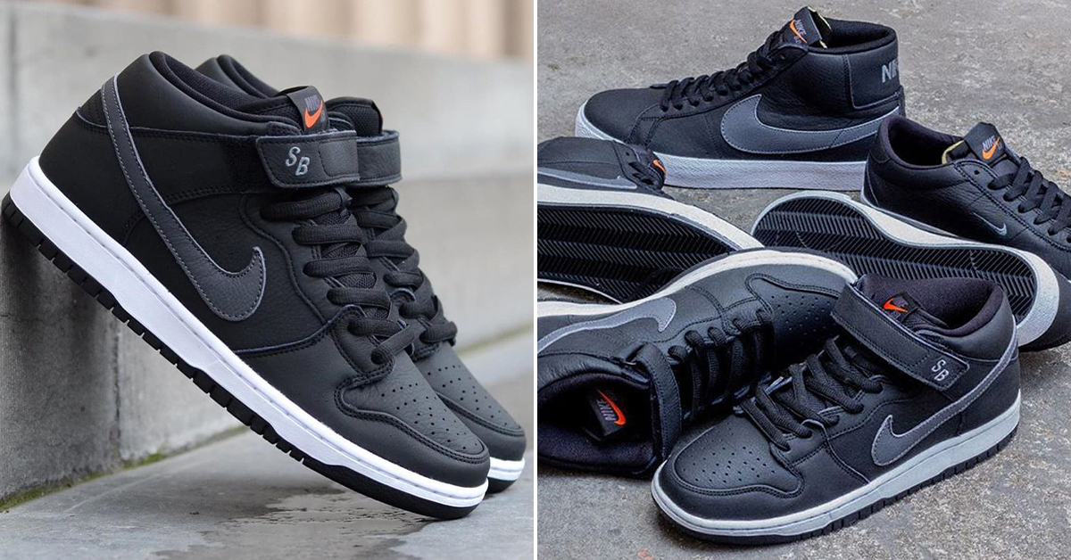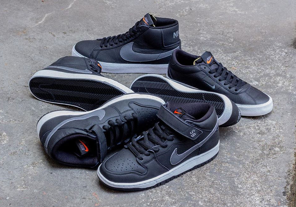 This 3-piece set consists of a Dunk Mid, Bruin, and Blazer Mid, each dressed in black premium full grain leather with dark grey accents on each model’s Swoosh logos. Each also feature orange detailing on the tongue tags and aglets, a nod to its limited “Orange Label” availability.