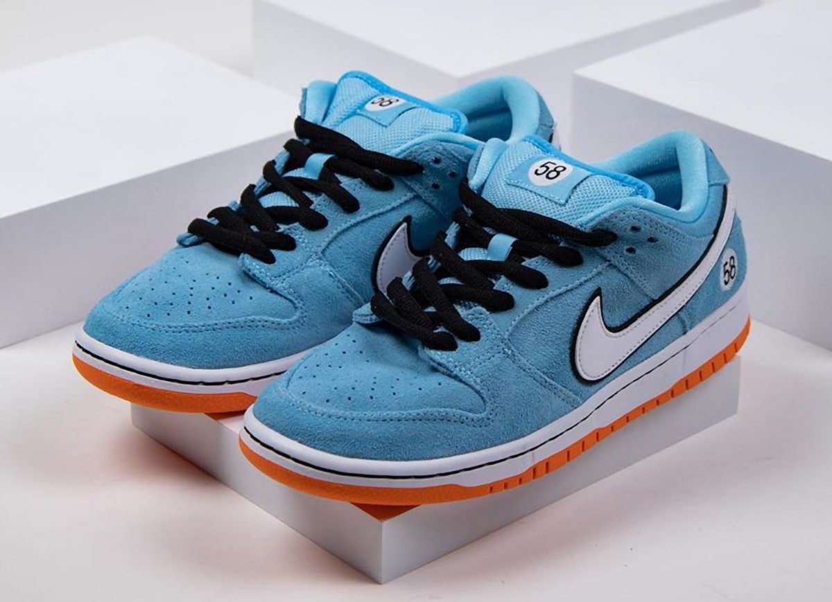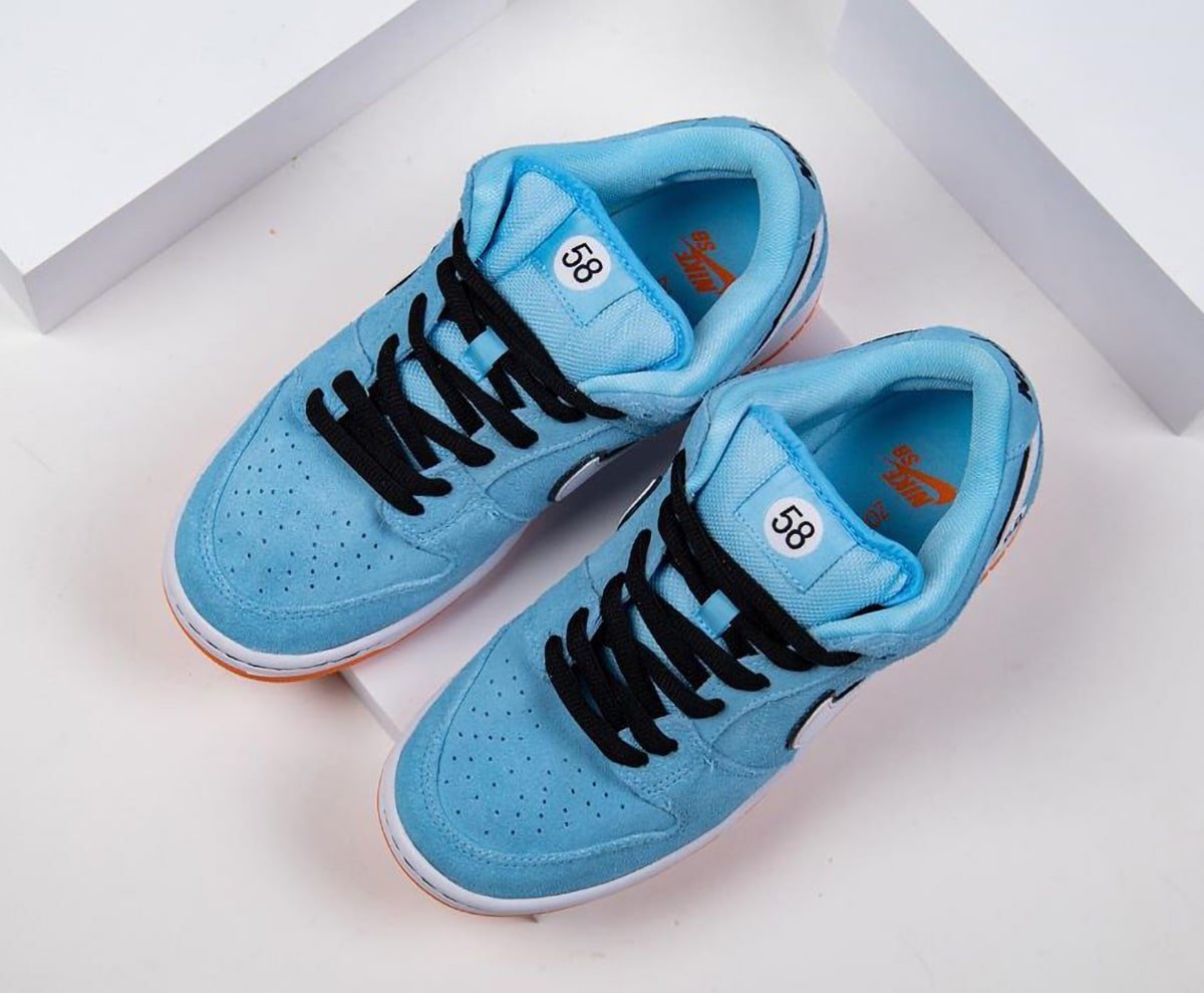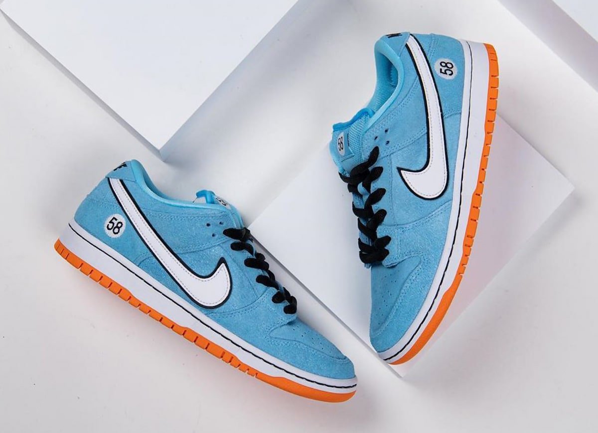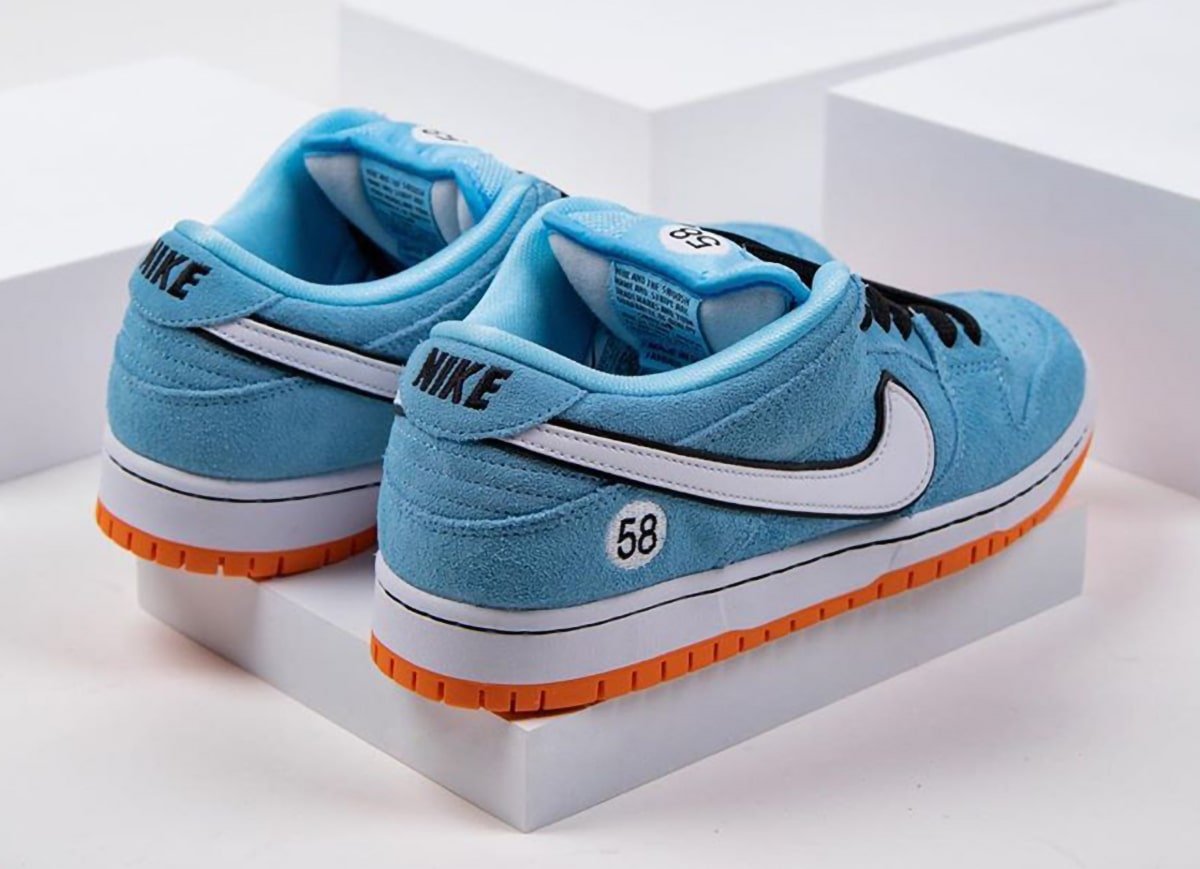 The Gulf Racing-inspired Nike SB Dunk Low come dressed in a zenith blue suede upper with a white leather Swoosh outlined in black (the black outline is also a signature Gulf design motif). Similar to how race cars feature a number on the hood and doors, this Dunk Low features a “58” on the heels and tongues (the number 58 resembles the letters “SB”). The sole unit consists of a white midsole and tangerine orange outsole.