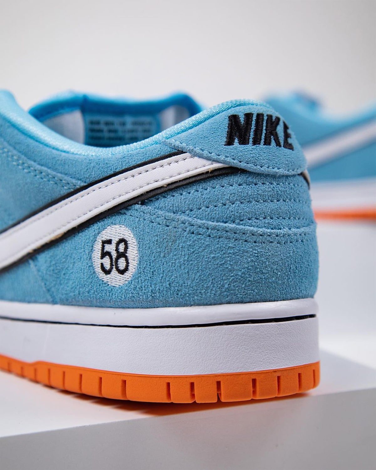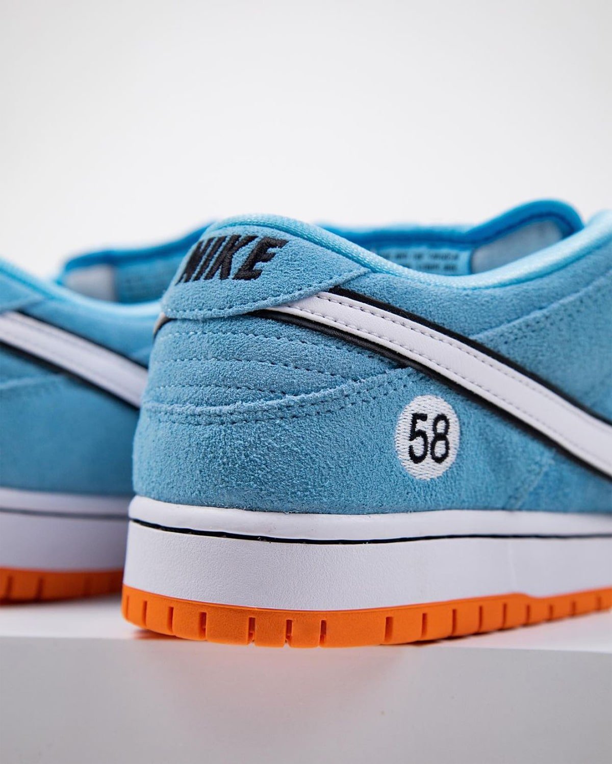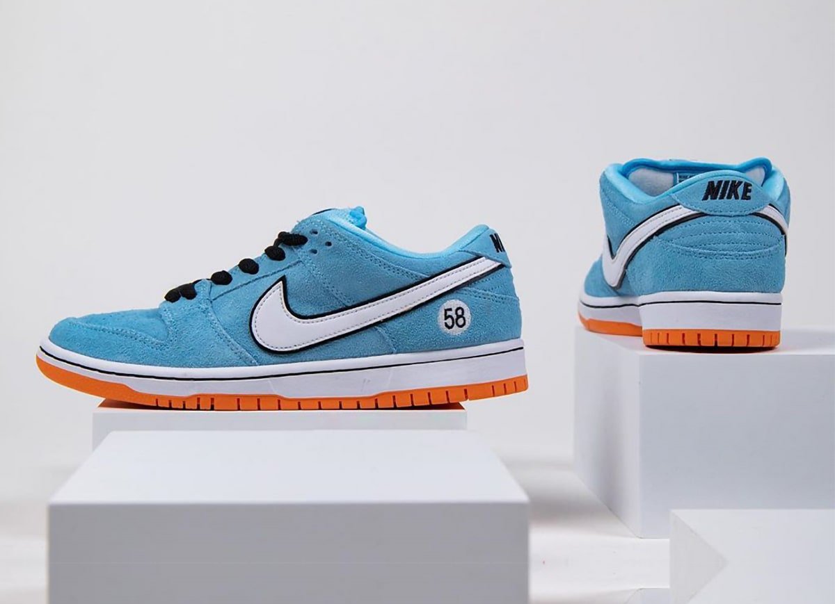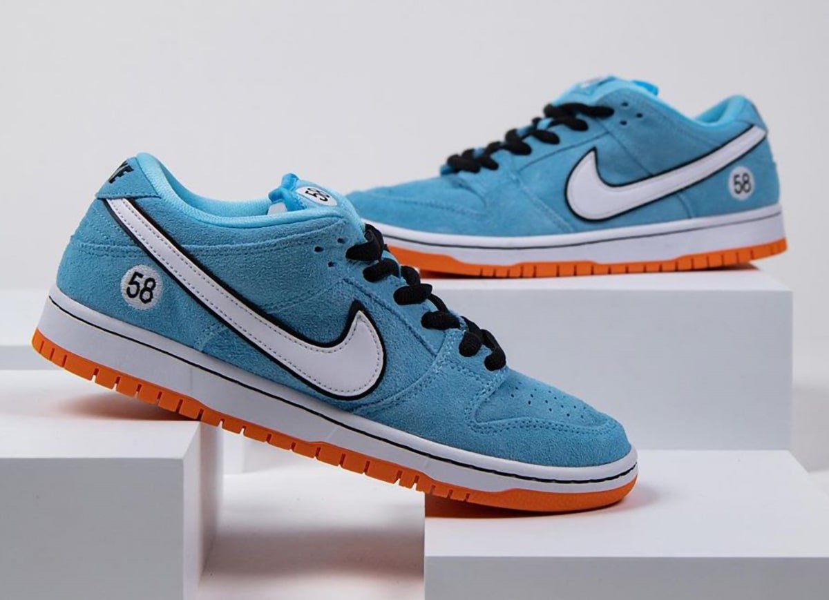 The Gulf Racing-inspired Nike SB Dunk Low come dressed in a zenith blue suede upper with a white leather Swoosh outlined in black (the black outline is also a signature Gulf design motif). Similar to how race cars feature a number on the hood and doors, this Dunk Low features a “58” on the heels and tongues (the number 58 resembles the letters “SB”). The sole unit consists of a white midsole and tangerine orange outsole.