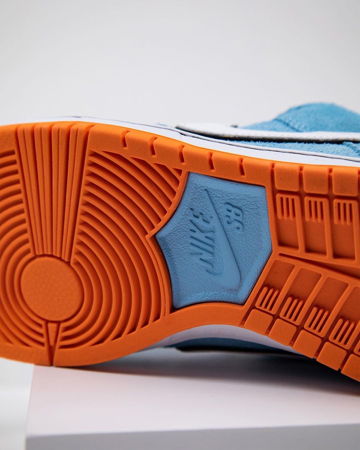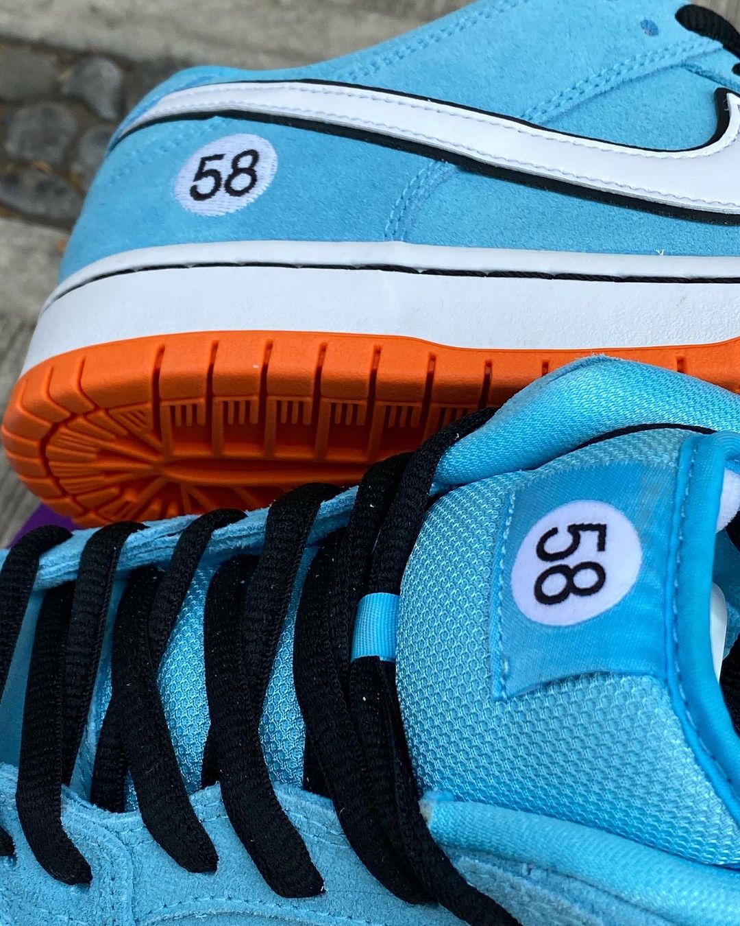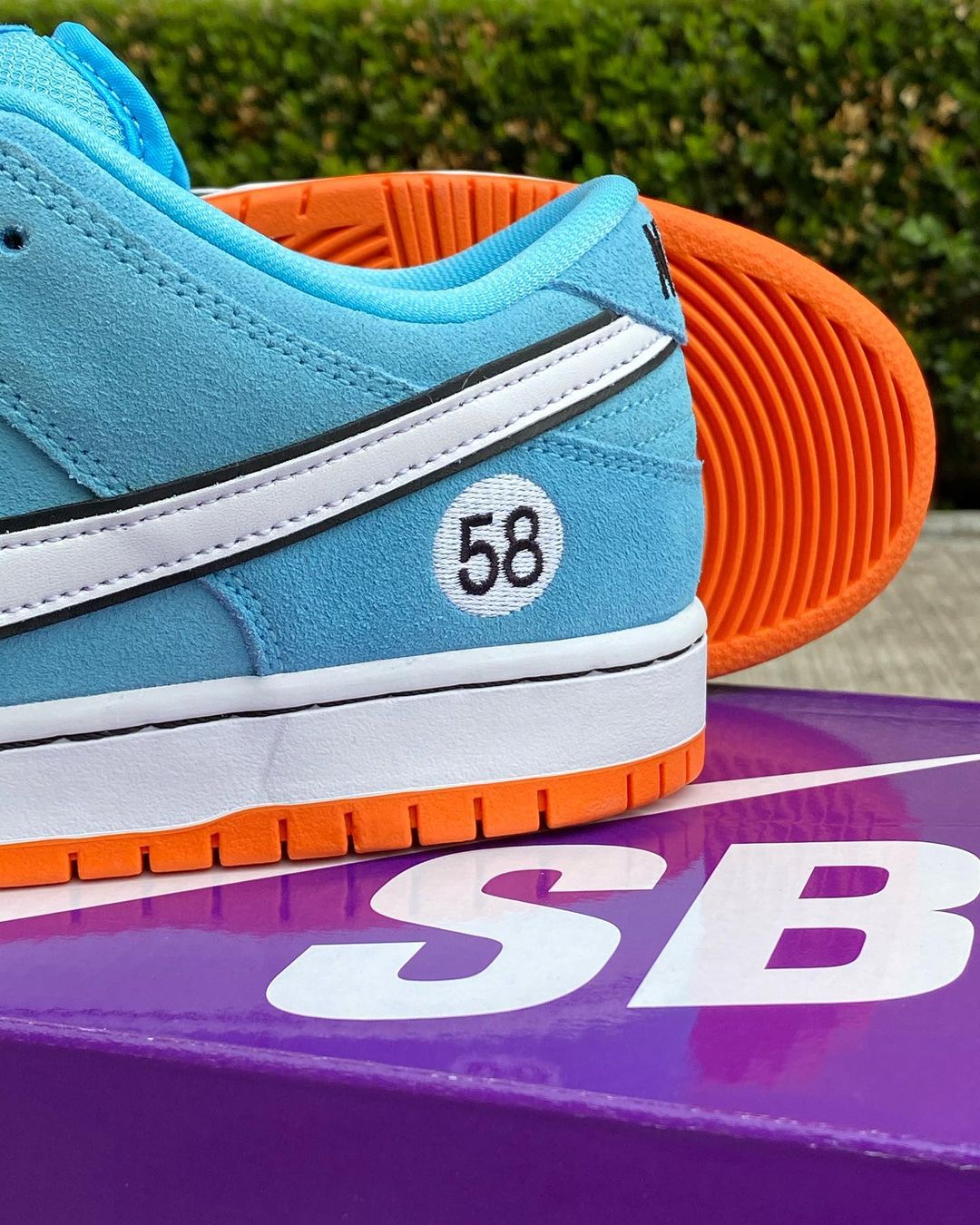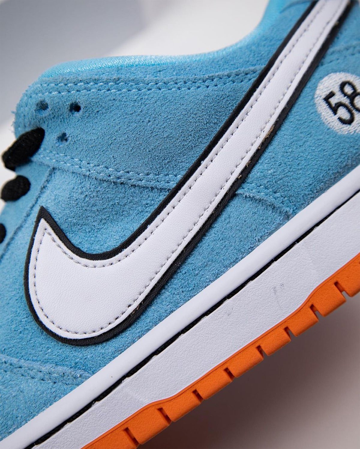 The Gulf Racing-inspired Nike SB Dunk Low come dressed in a zenith blue suede upper with a white leather Swoosh outlined in black (the black outline is also a signature Gulf design motif). Similar to how race cars feature a number on the hood and doors, this Dunk Low features a “58” on the heels and tongues (the number 58 resembles the letters “SB”). The sole unit consists of a white midsole and tangerine orange outsole.
