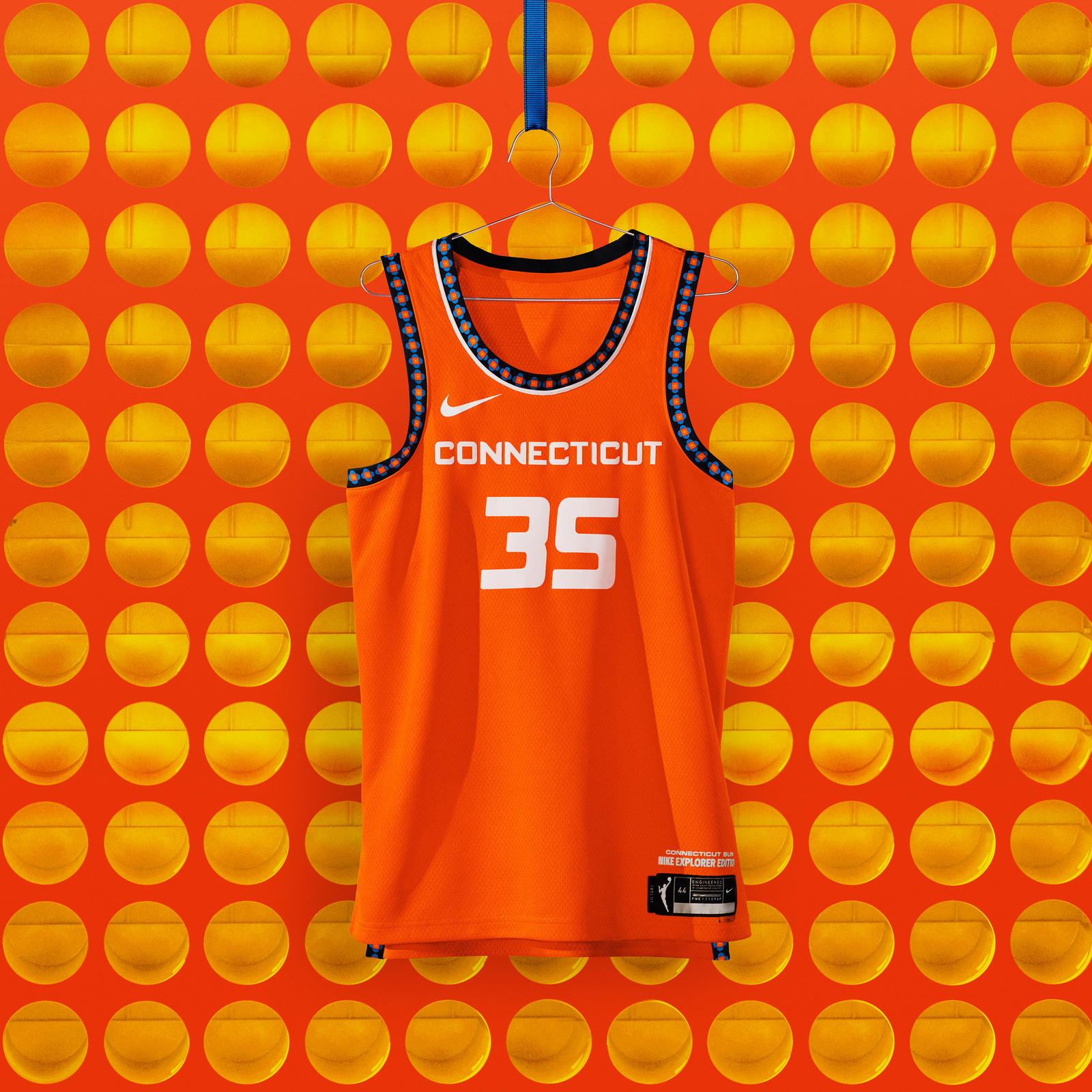 In reverence to the traditions and history of the state’s Indigenous people, the uniform features a repeating pattern of symbolic circles on taping details across an unforgettable orange that casts a sunlit-glow in an homage to the Mohegan Tribe’s heritage.