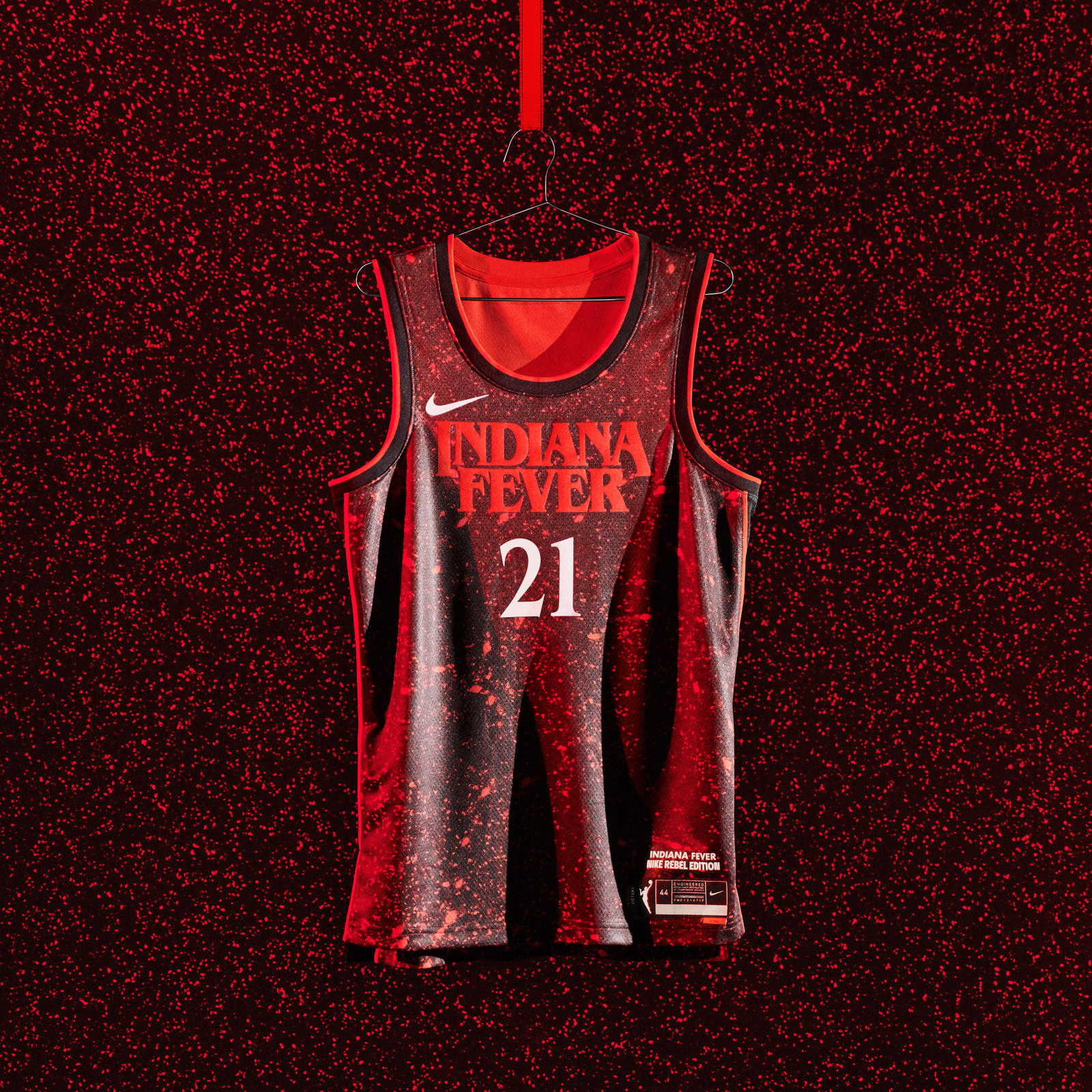 The uniform’s color, jersey wordmark and number font are drawn from Stranger Things, the hit series that takes place in the fictional town of Hawkins, Indiana.
