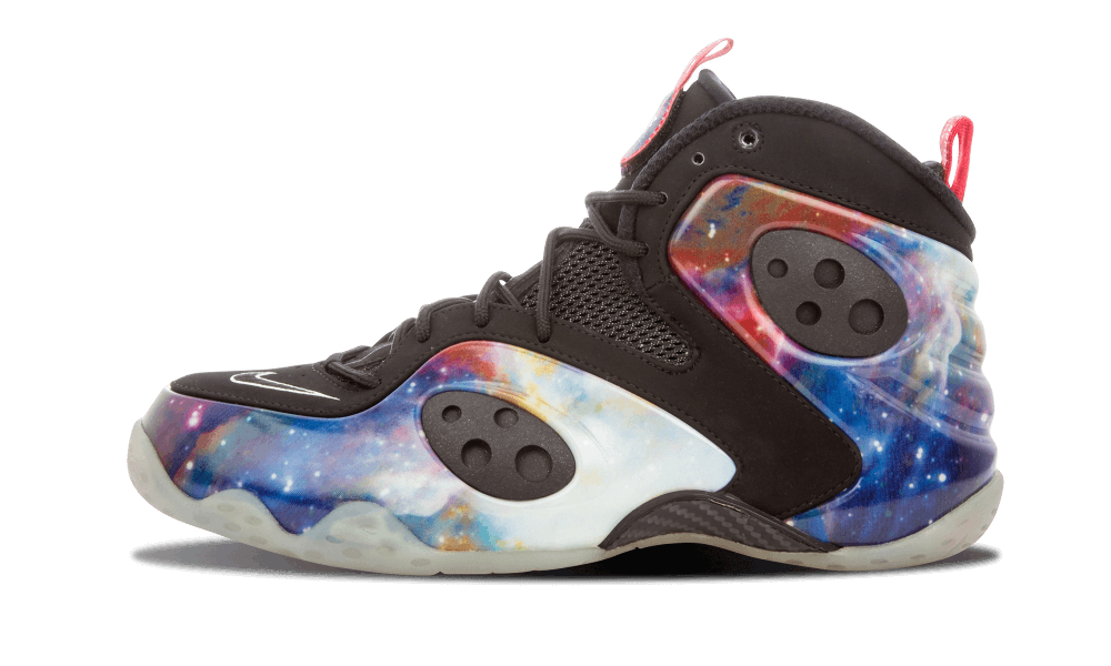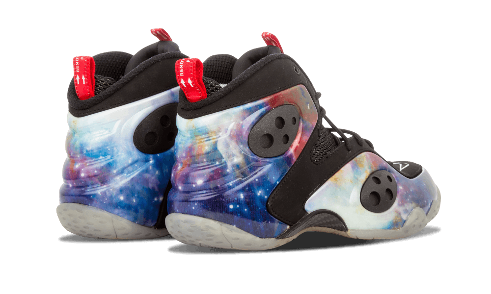 Featuring a “Galaxy” printed Foamposite shell overlay, and a Black based upper, the silhouette is completed with a translucent outsole and carbon fiber detailing.