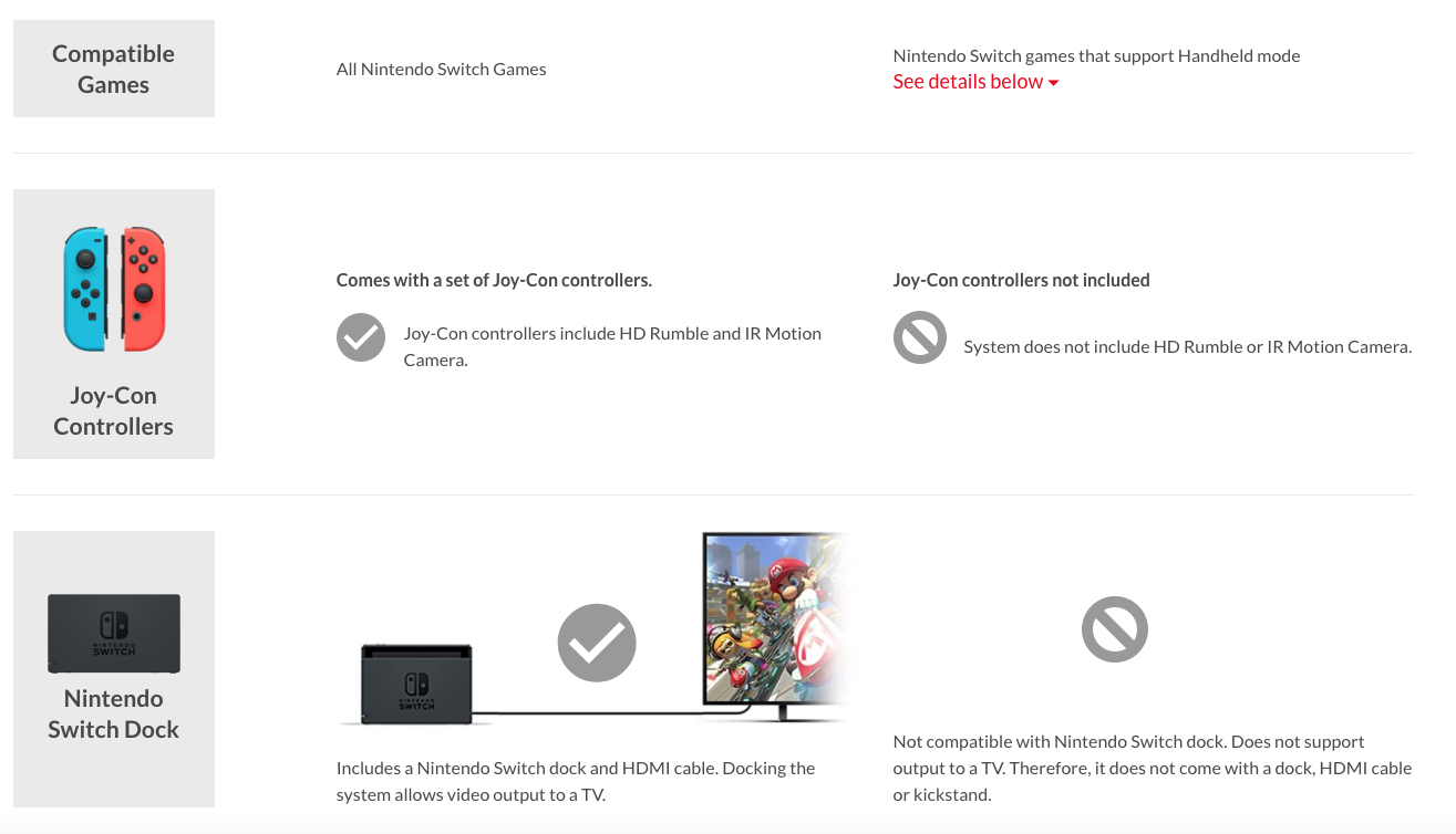 In the updated design, TV Dock compatibility, detachable JoyCons, HD rumble, and IR sensors for motion controls have been removed. This means that only games that are playable in handheld mode are compatible with the Lite, eliminating a few such as Super Mario Party.