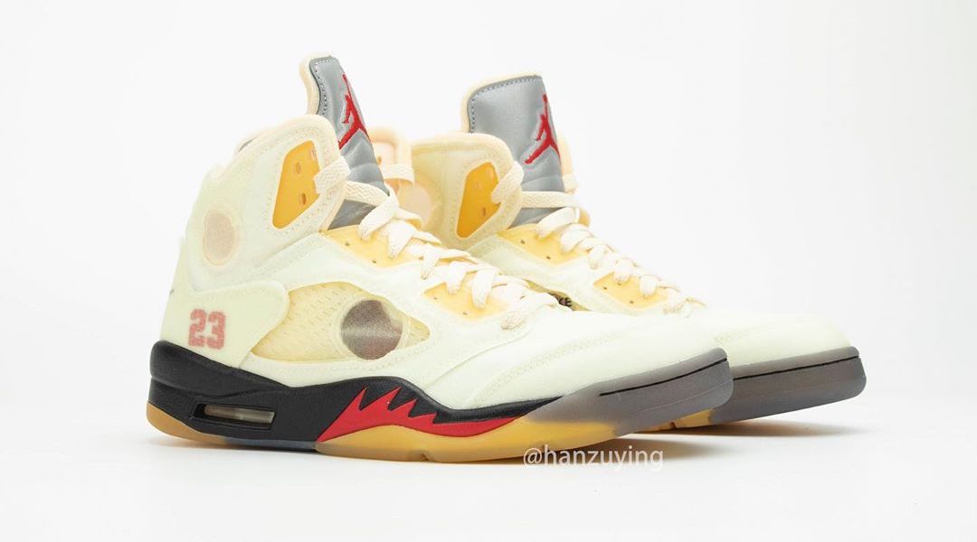 Update (10/14/20): Official images of the Off-White x Air Jordan 5 “Sail” are here. Catch these on Nike SNKRS and select retailers on October 24th. Aftermarket pairs are available via StockX and eBay.