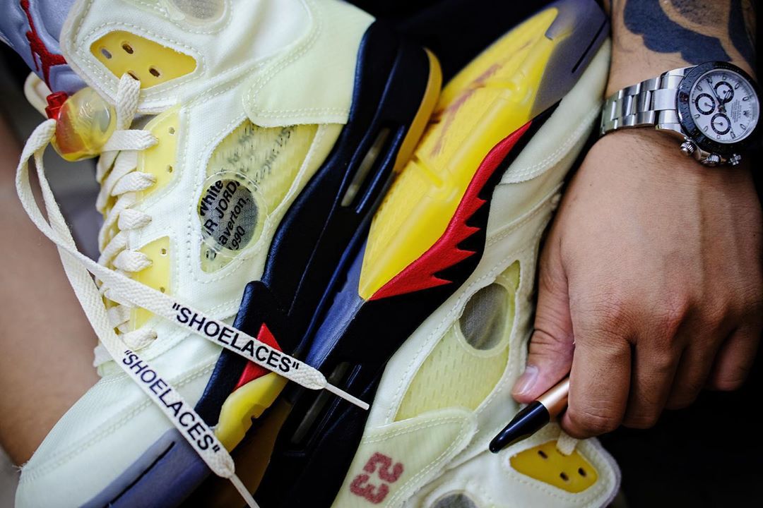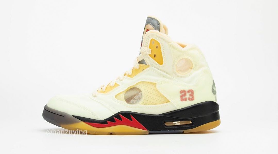 Update (07/20/20): Pairs of the upcoming Off-White x Air Jordan 5 “Sail” are beginning to surface. While the pair that Virgil previewed during ASW had a cream midsole, it appears that the retail release will feature a black midsole to more closely resemble the OG “Fire Red” colorway. Expect a release via SNKRS and select retailers before the end of the year. For now, check out the detailed photos below (c/o HanZuYing) and stay tuned to Modern Notoriety for updates.
