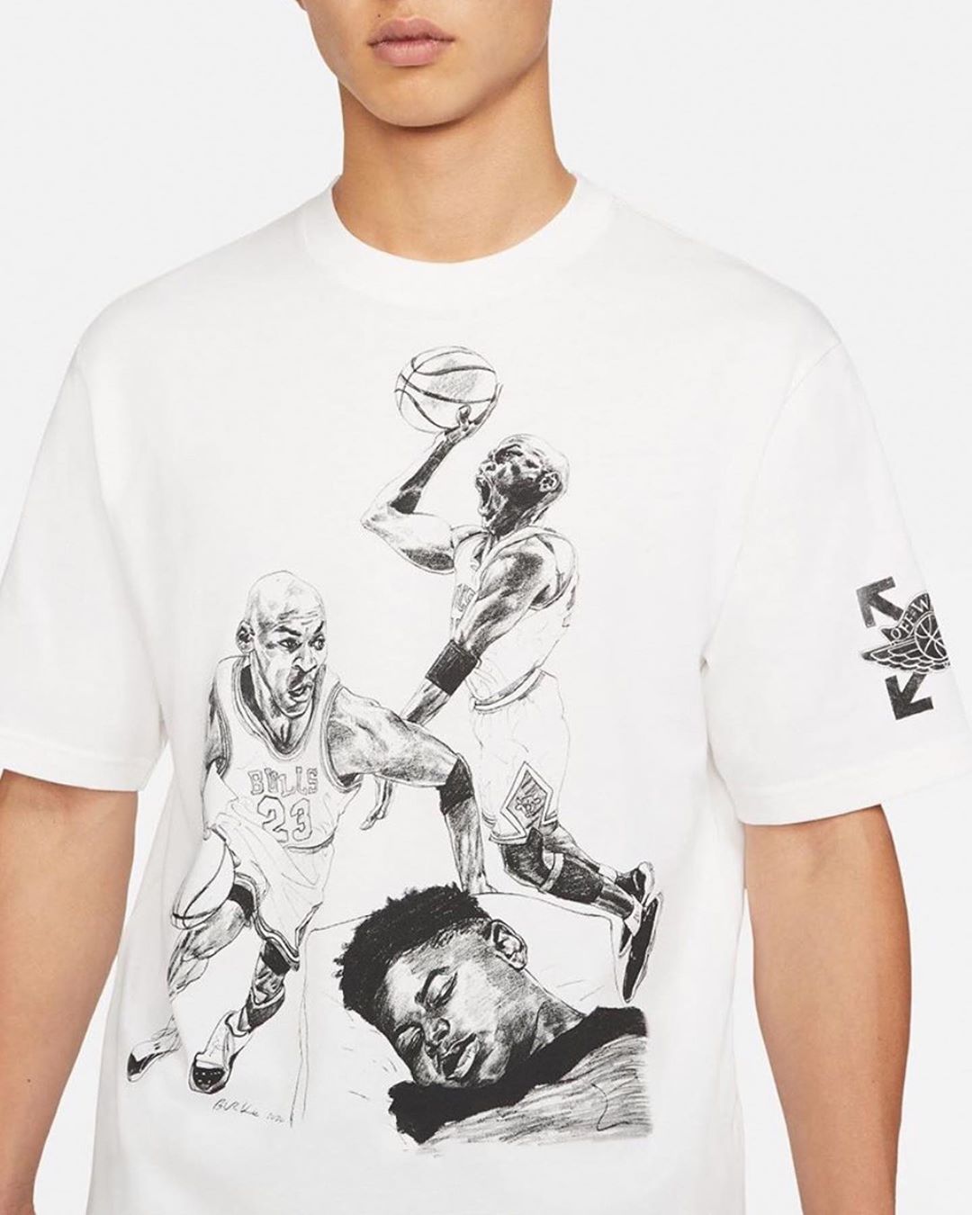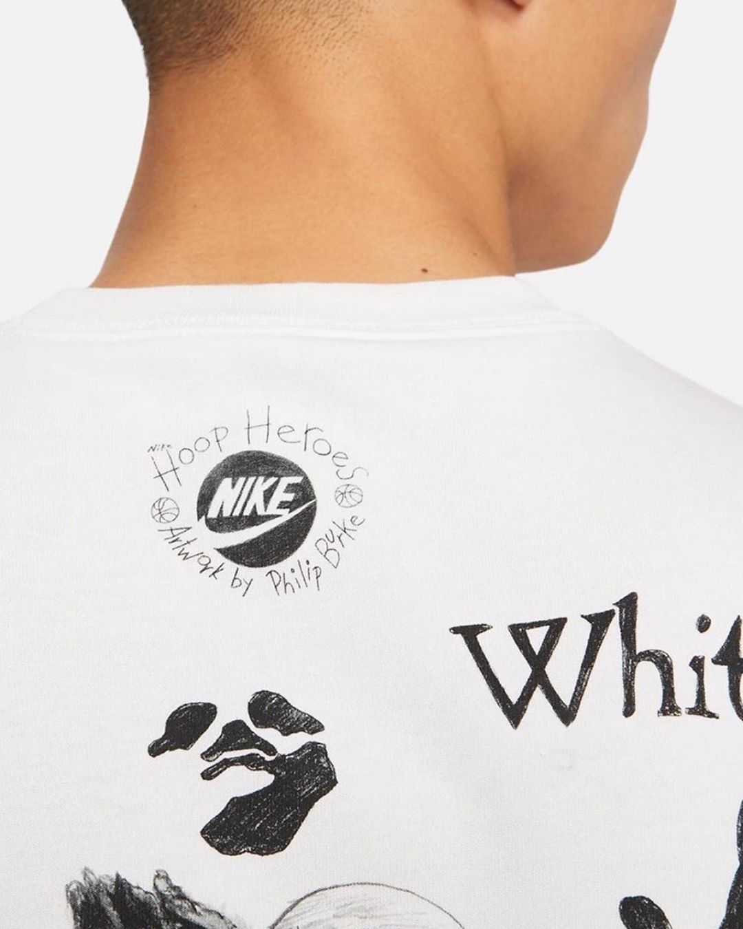 Update (10/12/20): Two pieces from the upcoming Off-White x Jordan apparel collection have been revealed in full. Along with the hoodie, the collection brings back the “Hoop Heroes” artwork by Philip Burke seen on a couple vintage Nike tees. Leaked images courtesy of py_rates_.