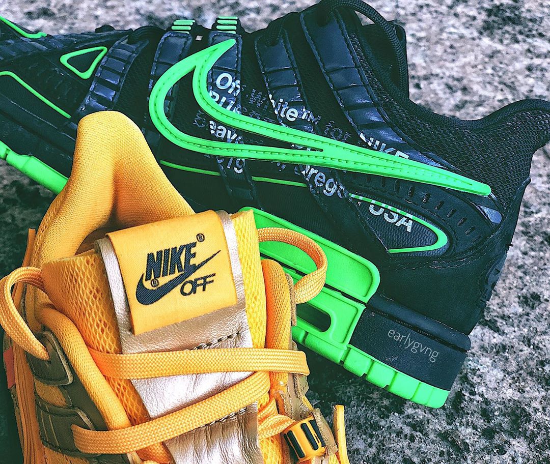 Update (04/15/20): Check out the latest detailed photos of the Off-White x Nike Air Rubber Dunk “Green Strike” and “University Gold” below, courtesy of Earlygvng.