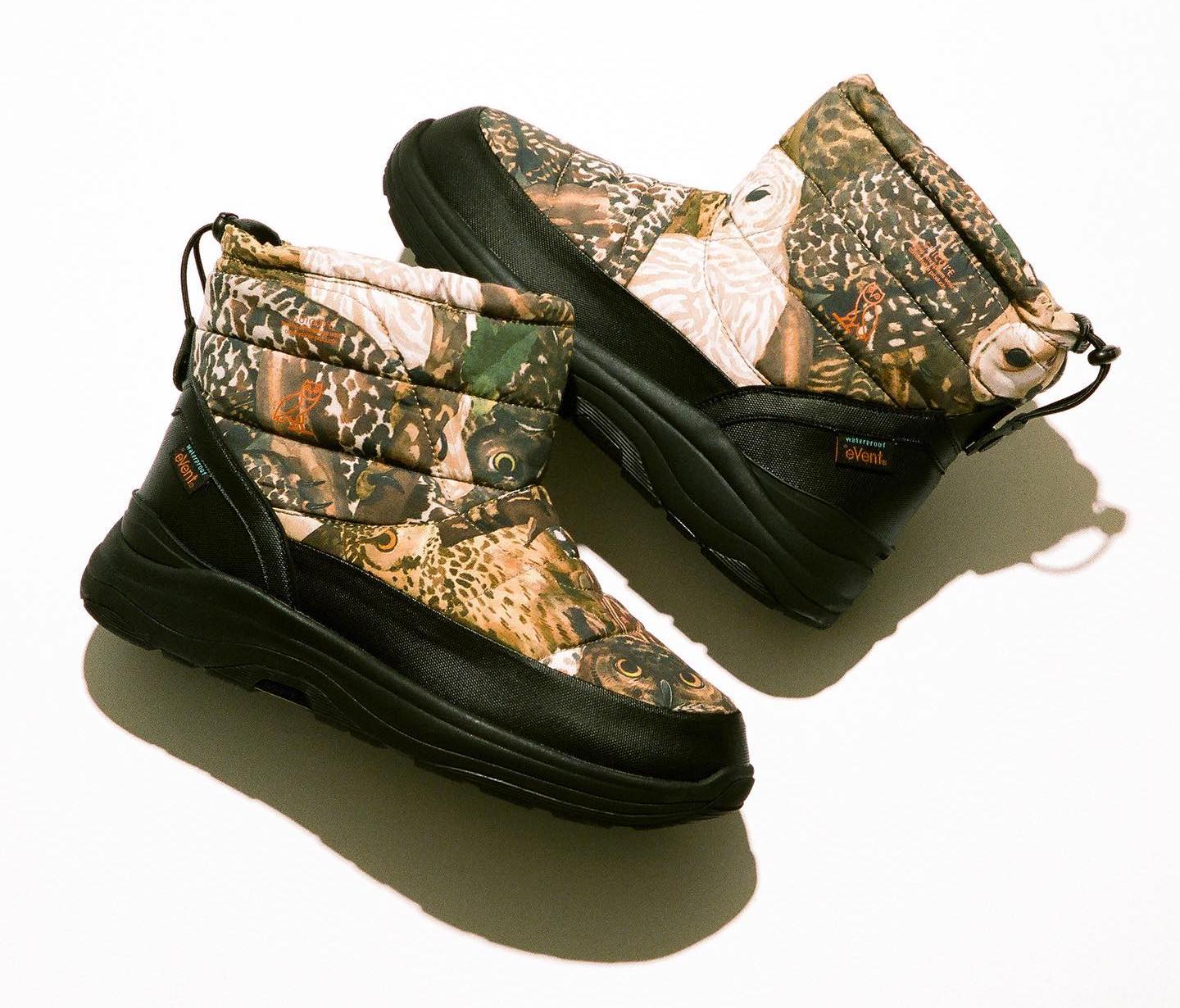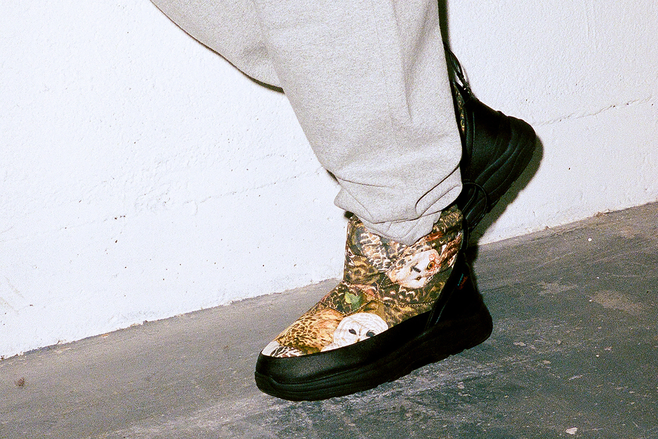 This release features two of Suicoke’s signature silhouettes. The first is the Bower, a boot with an upper shell made of nylon, PVC, and 3M Thinsulate. This is offered in a “Woodland Owl Camo” and “Night Black” colorway. The second silhouette is the Pepper, which is essentially a low-top version of Bower. OVO offers this one in “Night Black” and “Orange.” Both styles feature technical eVent material, which is both waterproof and breathable.