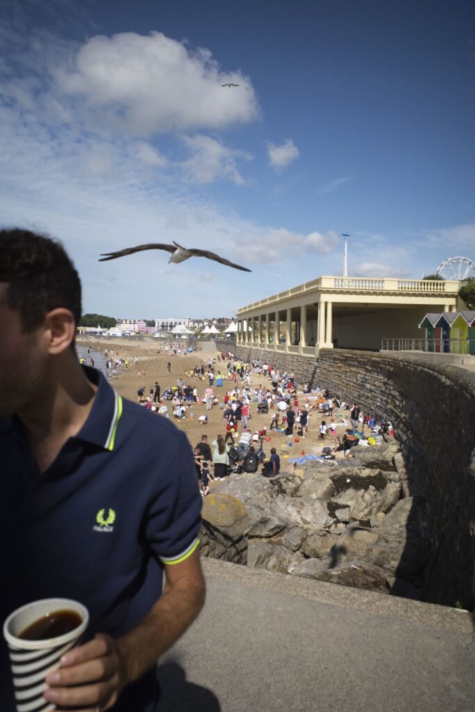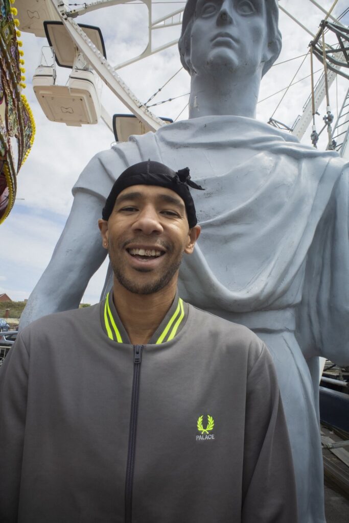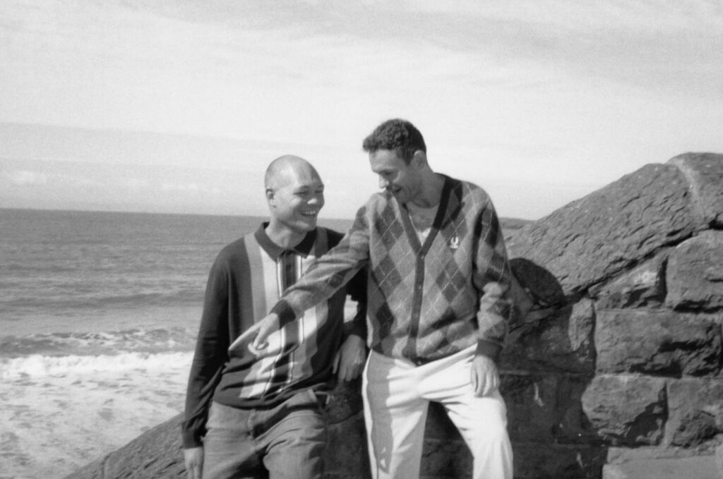 There’s also a full tracksuit in fluorescent twin tipping and embroidery, offered in baby blue with purple accents and in neutral grey with hits of bright of neon. A quintessentially British argyle cardigan and two colorways of a striped long-sleeve shirt round out the offering. It’s all presented in a campaign captured on the coast of Barry Island in Wales by Palace founder and creative director Lev Tanju.