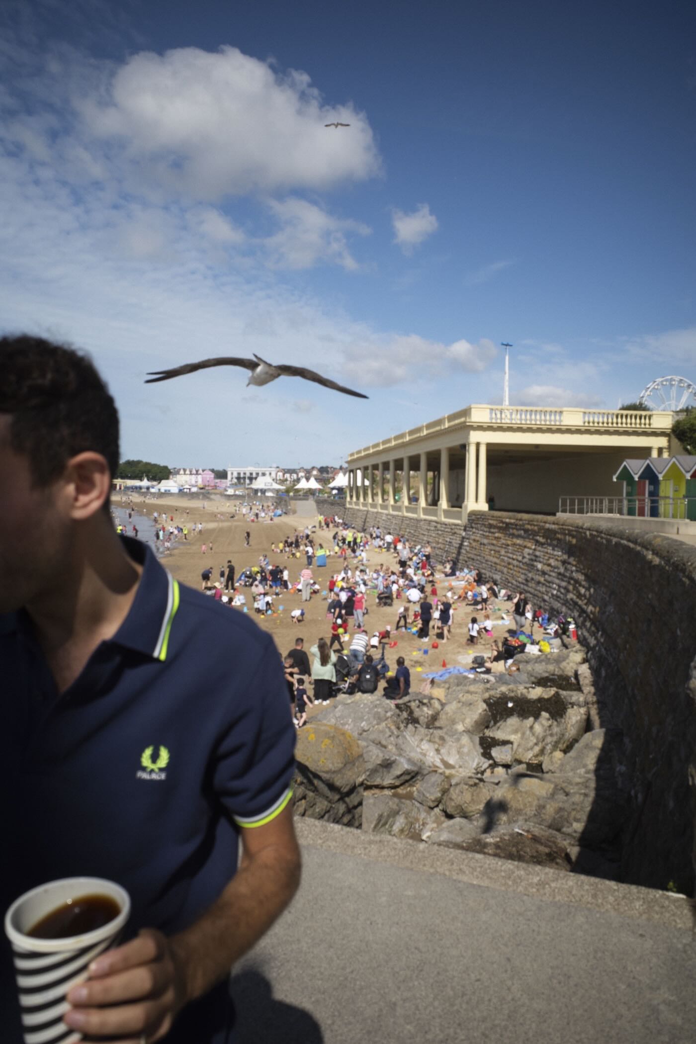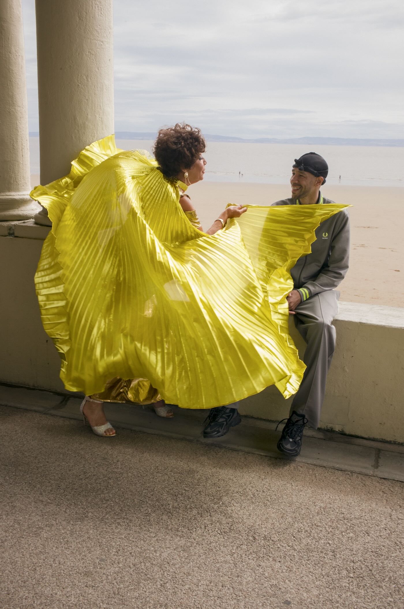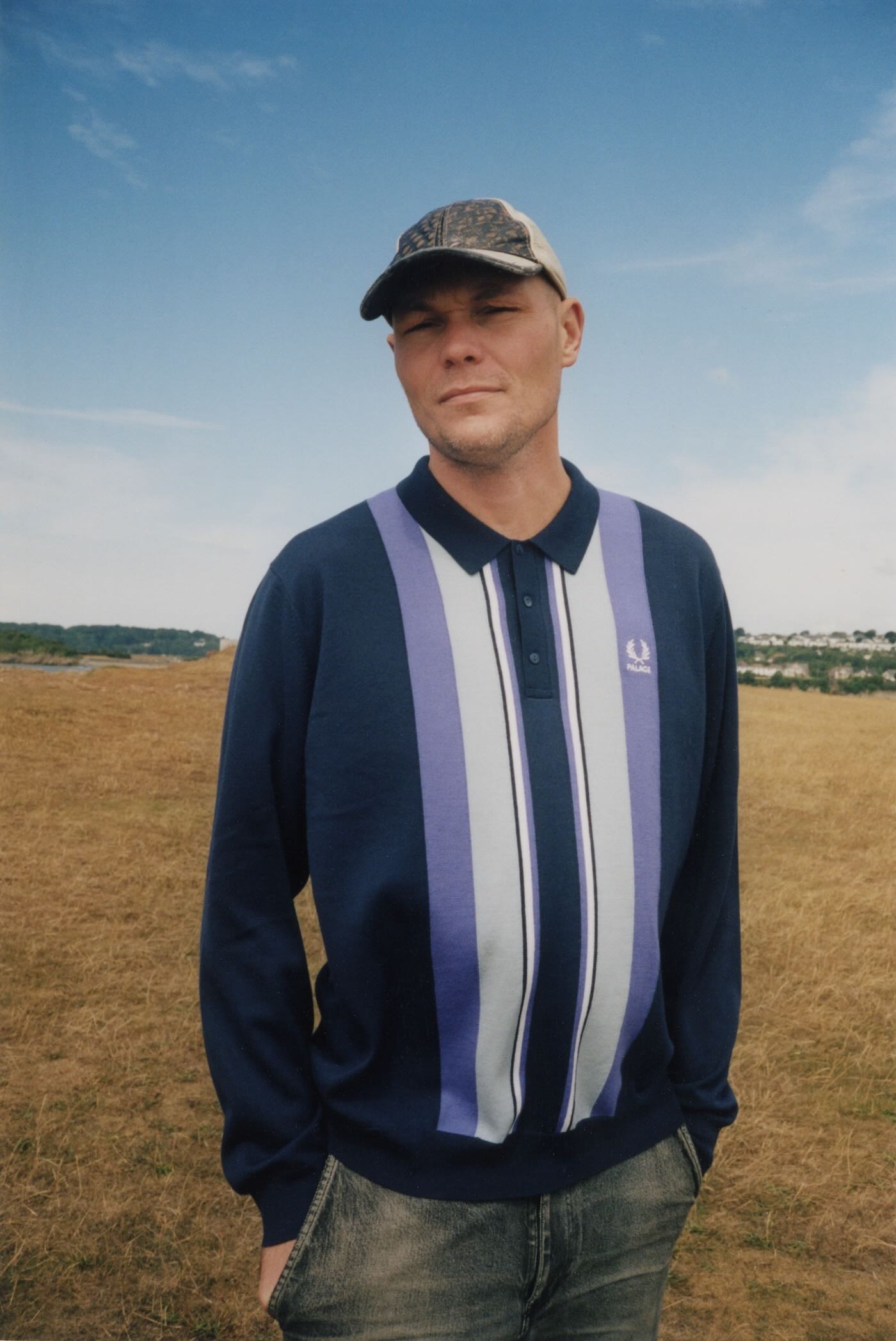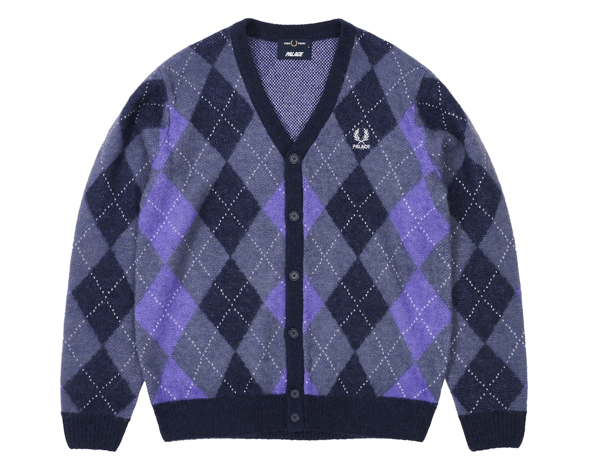 There’s also a full tracksuit in fluorescent twin tipping and embroidery, offered in baby blue with purple accents and in neutral grey with hits of bright of neon. A quintessentially British argyle cardigan and two colorways of a striped long-sleeve shirt round out the offering. It’s all presented in a campaign captured on the coast of Barry Island in Wales by Palace founder and creative director Lev Tanju.