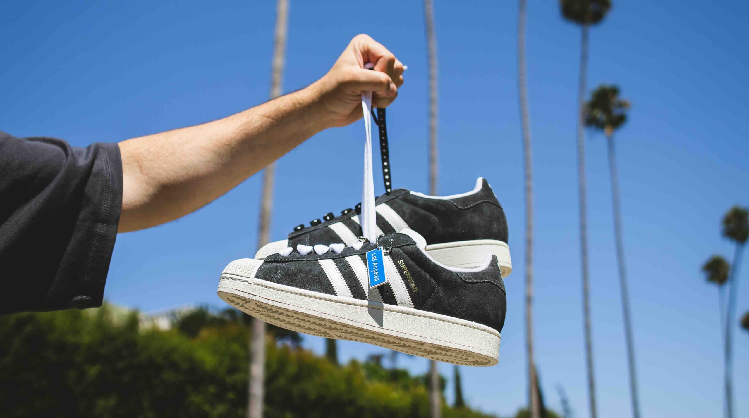 Releasing in partnership with iconic SoCal sneaker retailer Private Sneakers, the Los Angeles Superstar is designed to look like a vintage t-shirt with washed black suede uppers, cracked leather Three Stripes on the side panels, and an upside-down shirt tag on the tongue inspired by archival adidas designs. An angel wing logo on the heel pays tribute to the City of Angels’ lasting influence in fueling dreams and elevating success. Additional goodies that come with the shoe include a set of palm tree pins, star-printed laces, custom graphic insoles, and street sign hangtags.