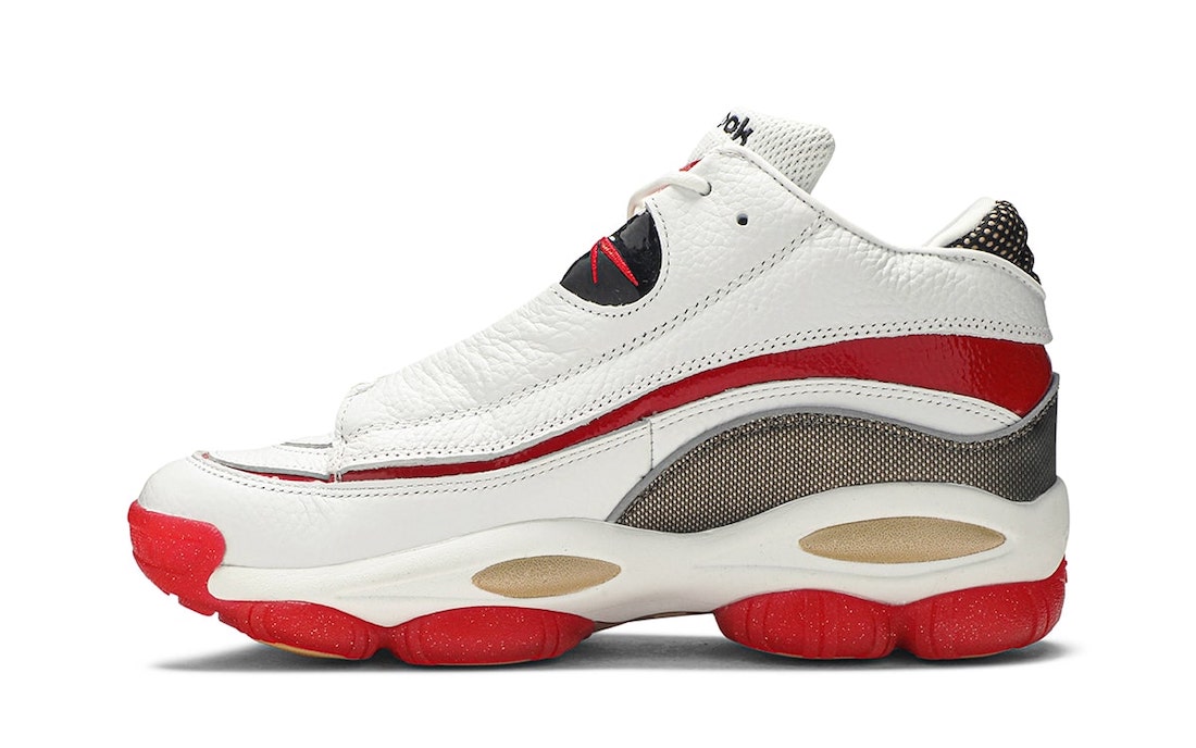 The Reebok Answer 1 was lighter, slimmer, and more sleek than the Question, and was also the first basketball shoe to feature DMX technology. Another notable feature of the shoe is the lacestay overlays, which featured a split design that acted almost as a shroud to cover the laces. The OG white/red colorway, last retro’d in 2018, matched the 76ers home jerseys at the time, with white tumbled leather making up the most of the upper, complemented by red, black, and gold accents.
