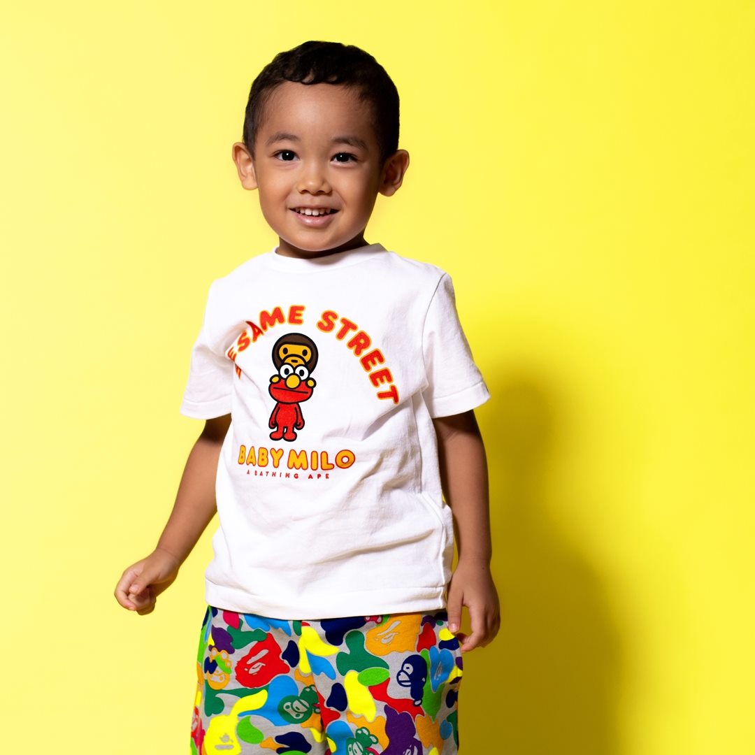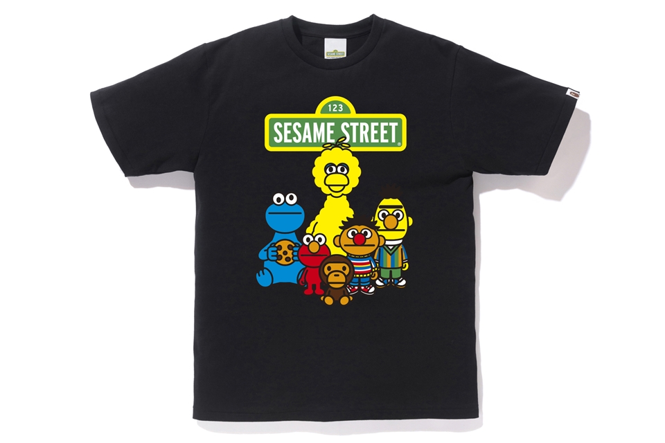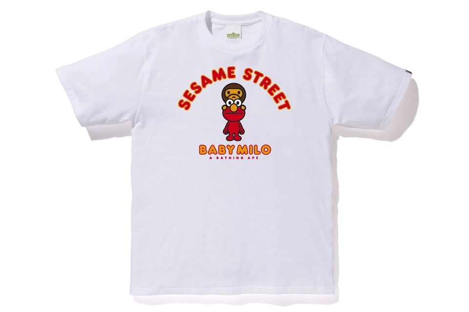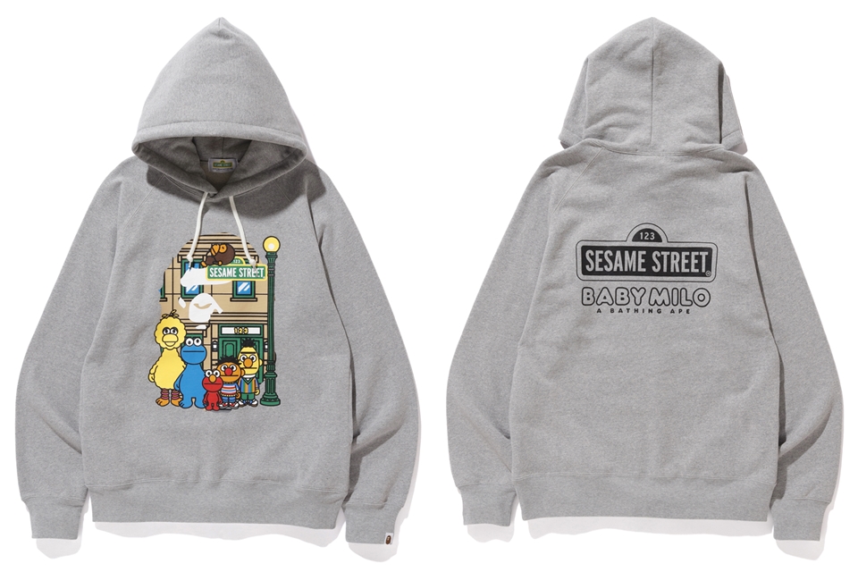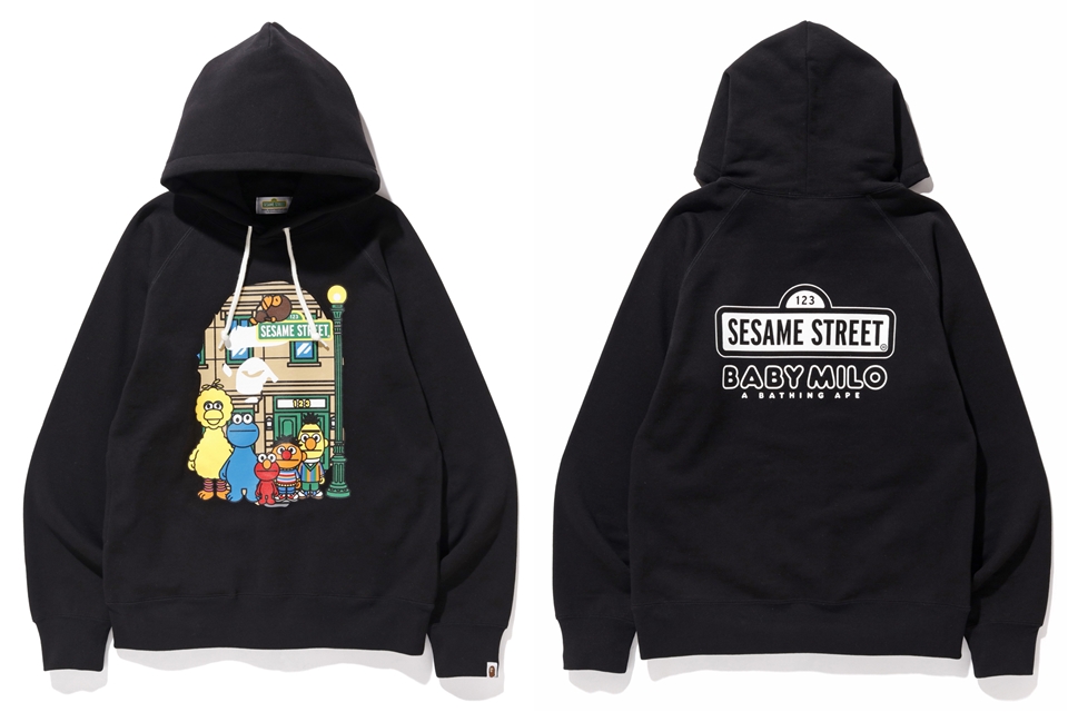 The collection includes hoodies, tees, and a few accessories with illustrations of Elmo, Big Bird, Cookie Monster, Bert and Ernie in the style of Baby Milo. The hoodies and a few shirts will have the cast standing in front of a BAPE head along with other shirts that include Baby Milo interacting with individual characters.