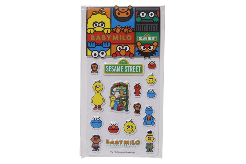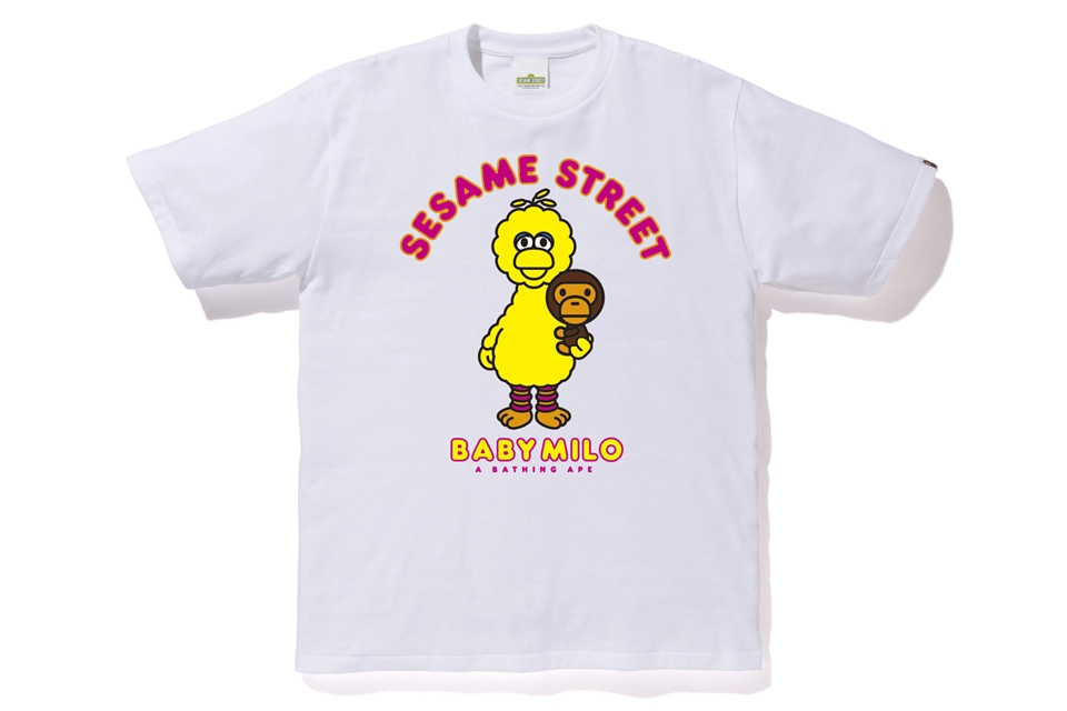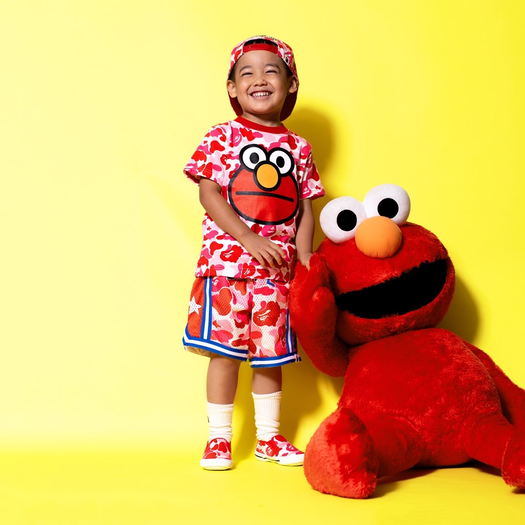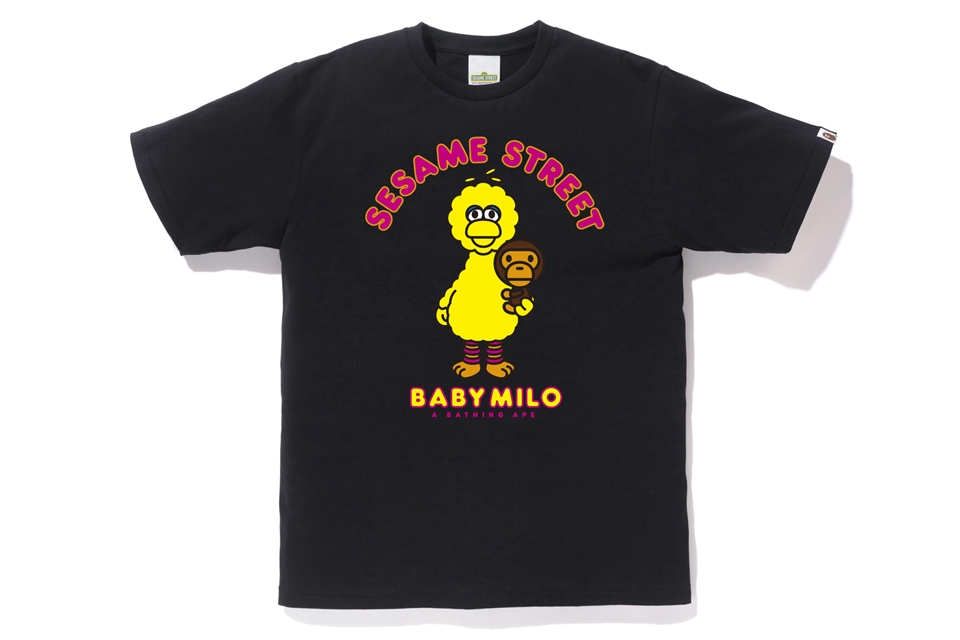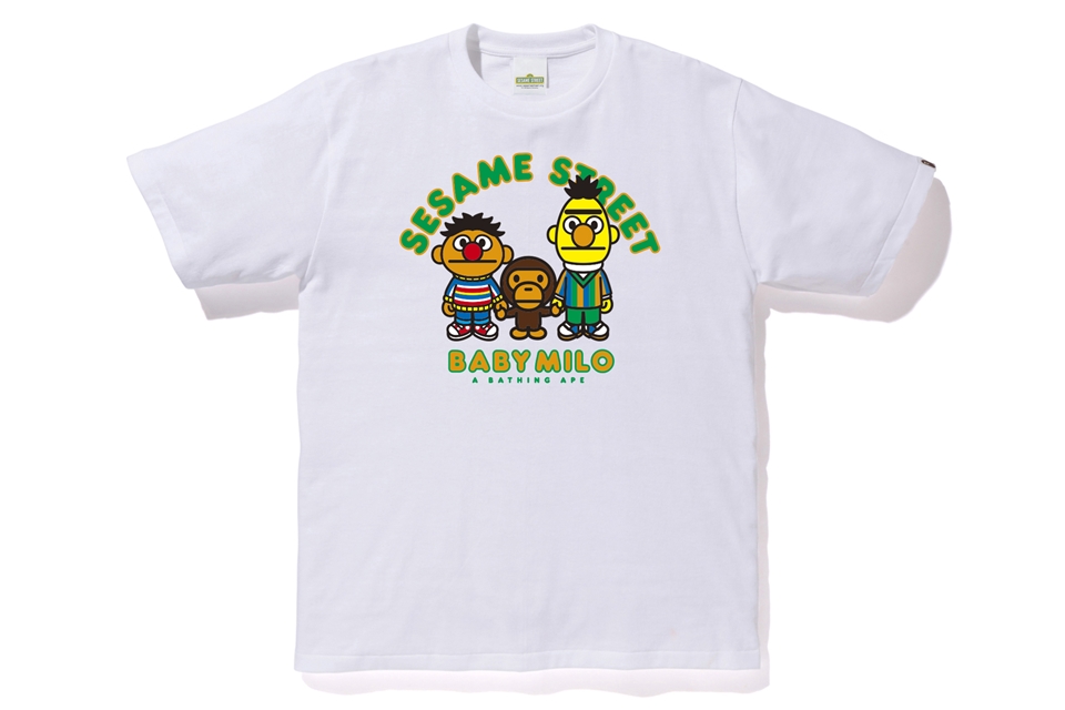 The collection includes hoodies, tees, and a few accessories with illustrations of Elmo, Big Bird, Cookie Monster, Bert and Ernie in the style of Baby Milo. The hoodies and a few shirts will have the cast standing in front of a BAPE head along with other shirts that include Baby Milo interacting with individual characters.