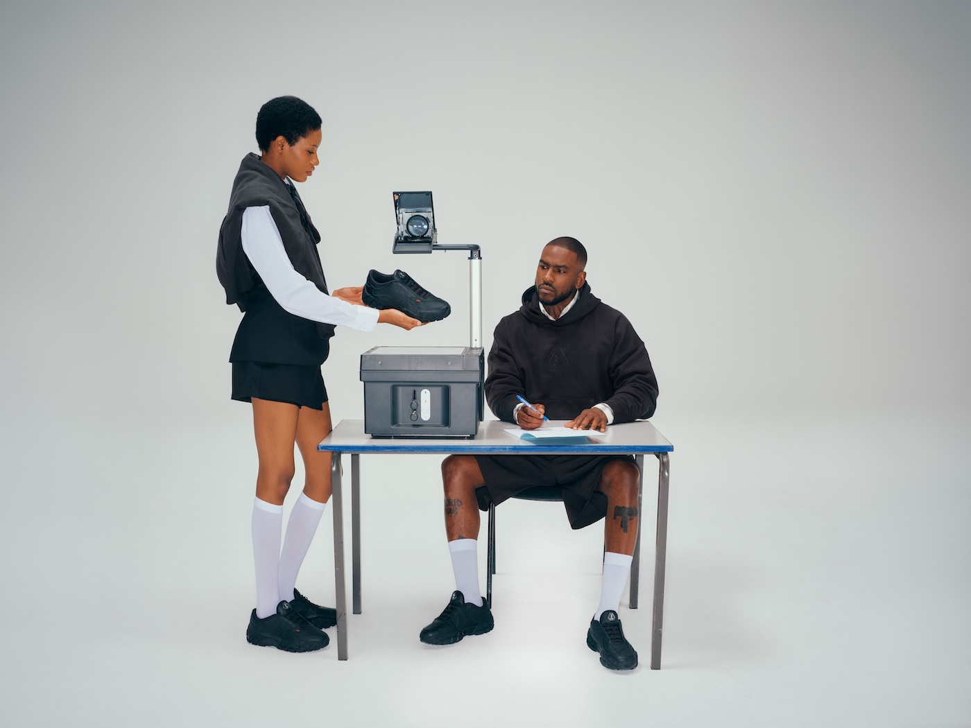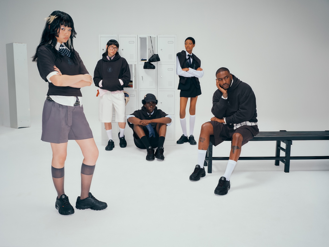 The apparel is accompanied by an all-black Skope Forever Low in smooth leather, featuring rope laces and a hiking sole. The silhouette feels like a school shoe, plain and simple, with even the Formstrip reduced to a stitch, though the silver tongue badge and tags with contrasting red and green branding add some flair to the design.