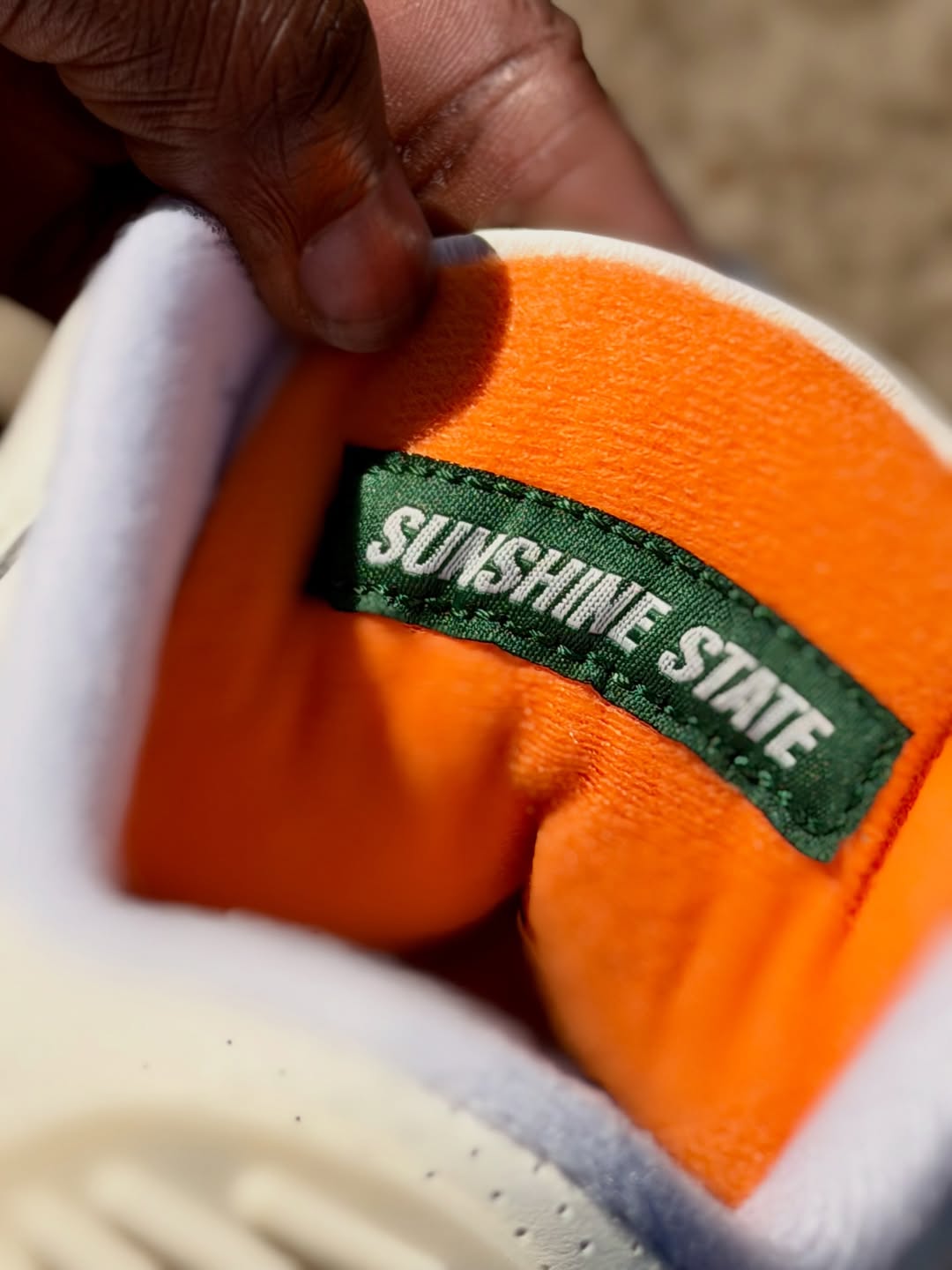 The SoleFly 3s feature white leather uppers paired with suede overlays in Miami colors, green on the toe cap and orange at the heel. Additional orange and green hits are found throughout the design, and SoleFly’s logo is embossed on the lateral heels.