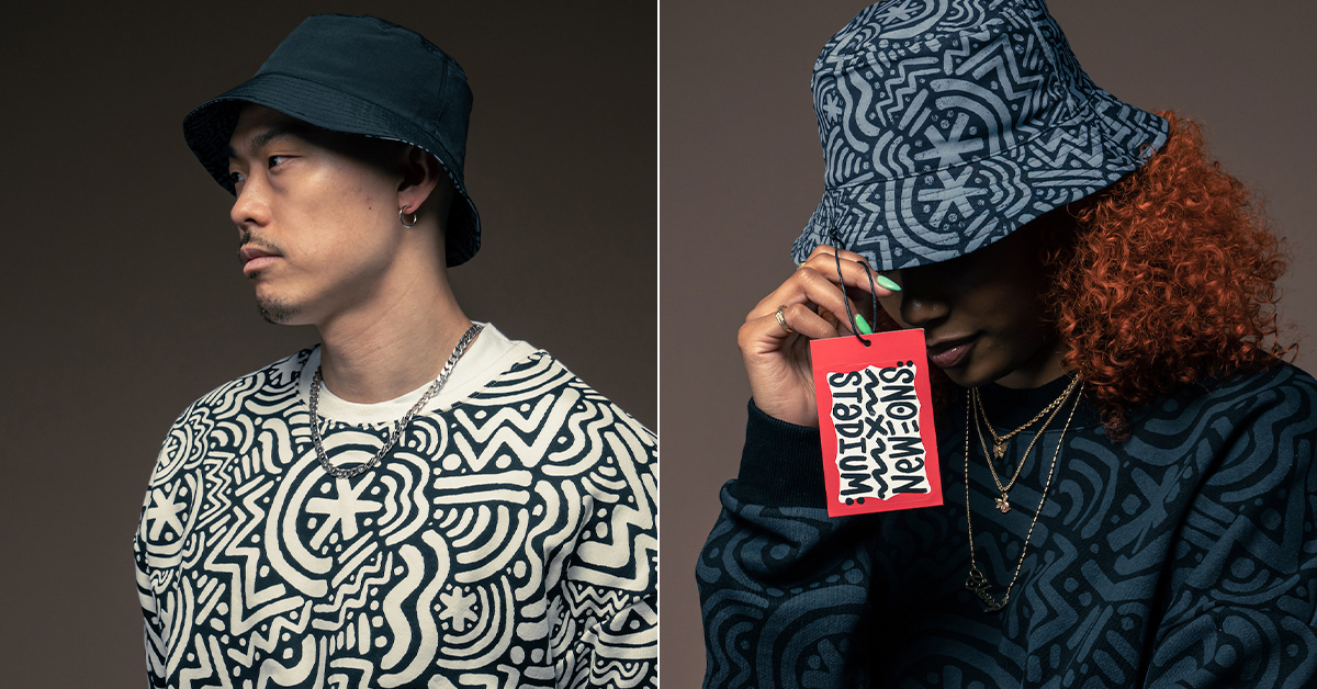 With roots in NYC’s graffiti scene, SNOEMAN has been in the game for over 20 years. He is best known for his depictions of often overlooked objects that are quintessential to New York City life, such as bodega storefronts, pizza boxes, and fire hydrants. His STADIUM collection consists of a french terry cotton crewneck, available in black and white, and a reversible bucket hat constructed in heavyweight cotton twill. Both come dressed in the artist’s “Zig Zag” artwork inspired by African textiles, Keith Haring, and graffiti culture.