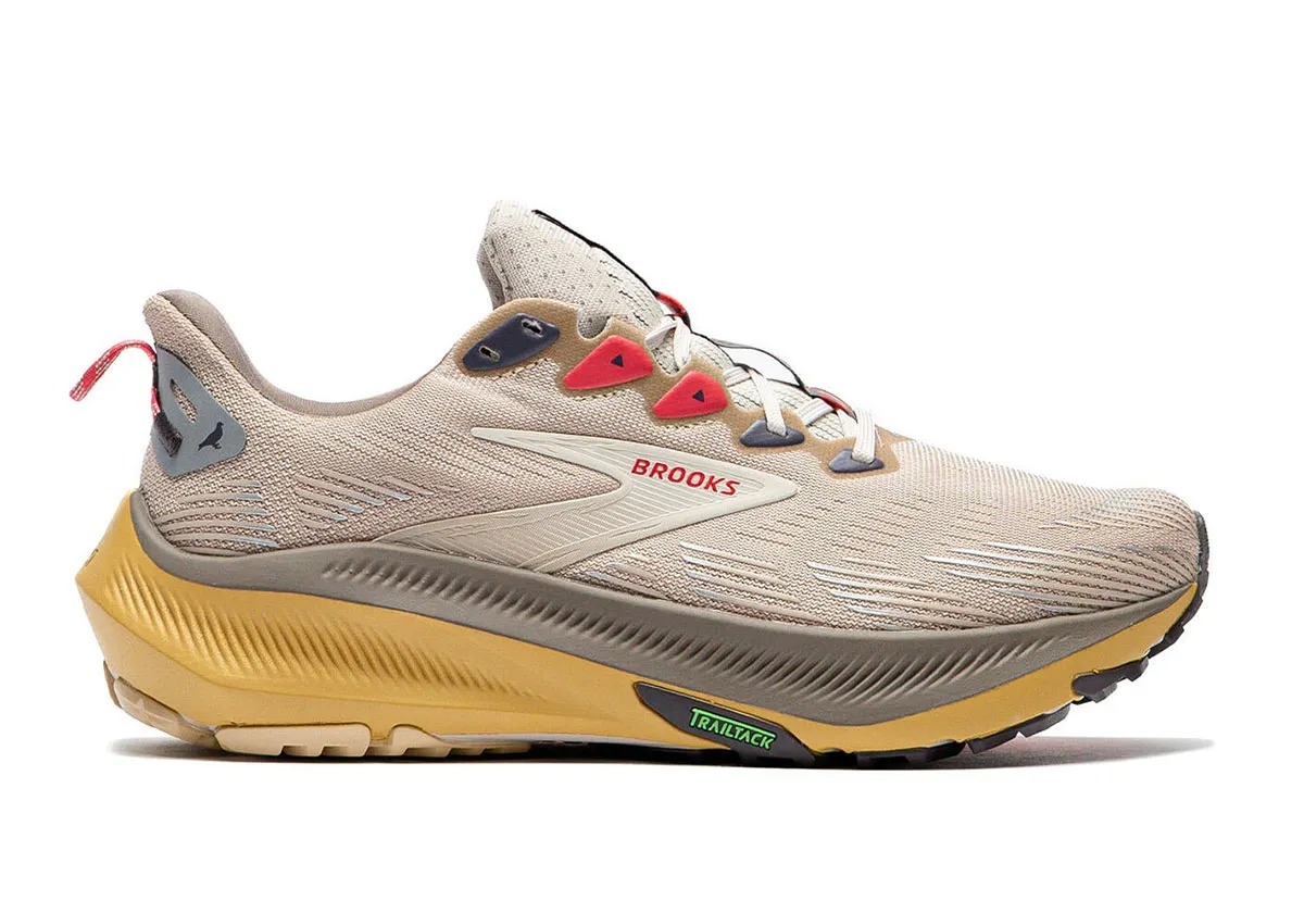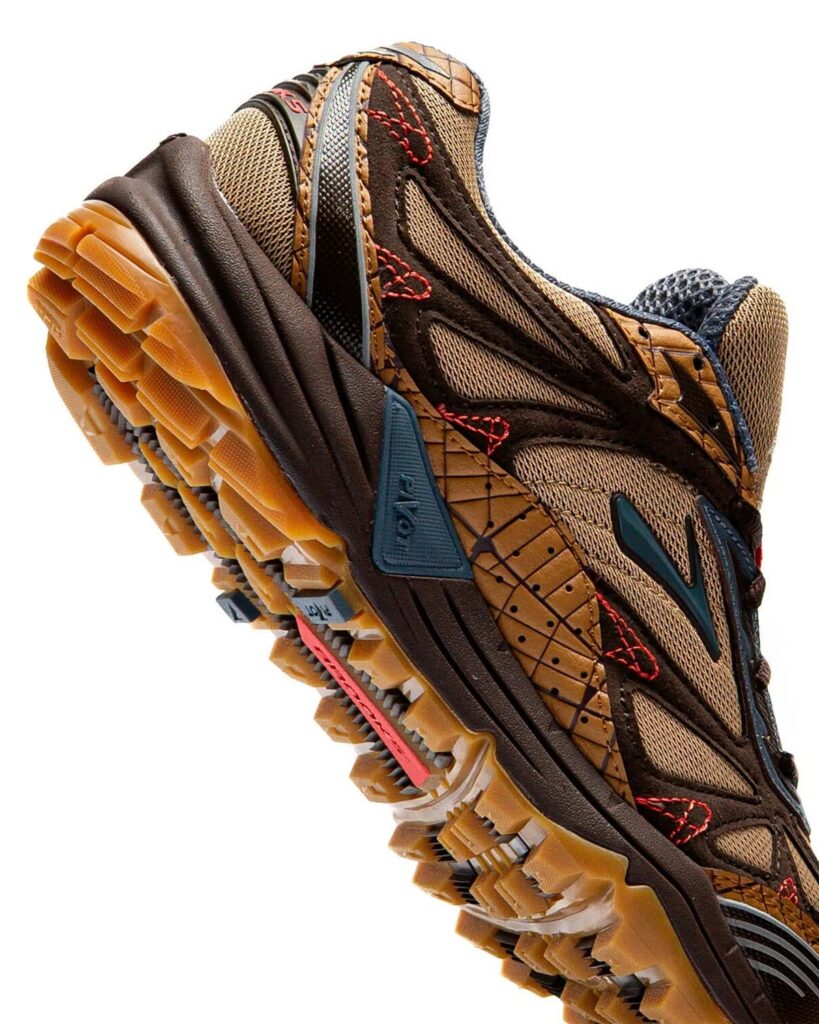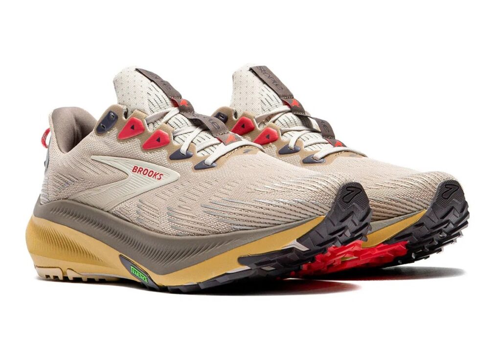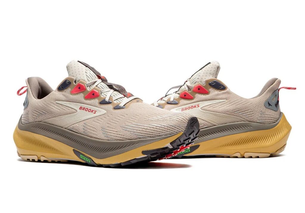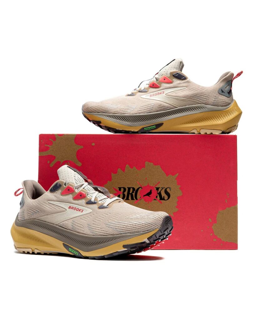 On the other end of the spectrum, the Ghost Trail represents Brooks’ current performance ethos. Built with a streamlined, one-piece mesh upper in tan, the silhouette features a thick, cushioned midsole split between grey and light brown for visual depth. Red laces and a heel pull tab unify the pack, while the overall construction prioritizes comfort, durability, and everyday wearability, whether on the trail or the pavement.