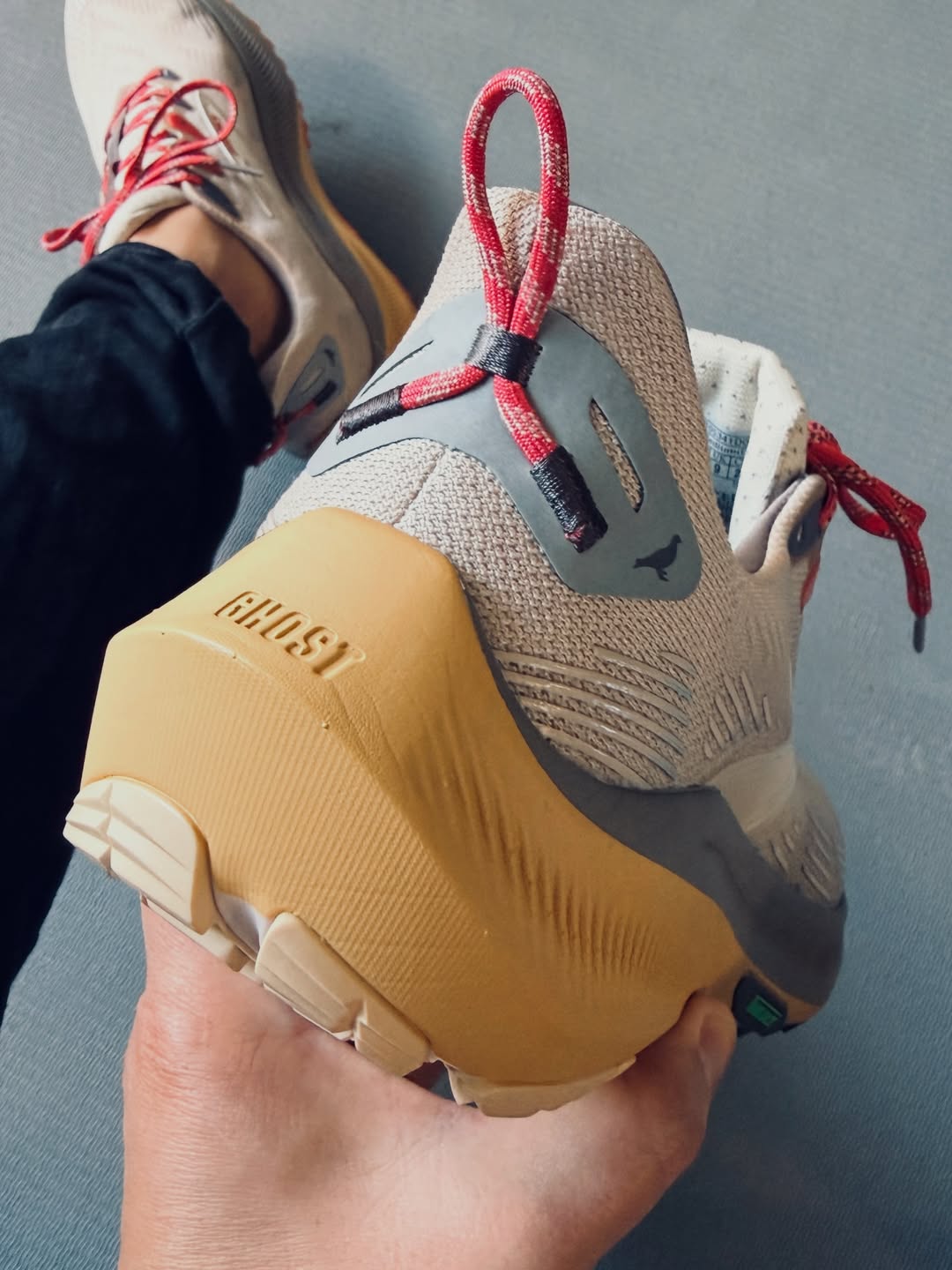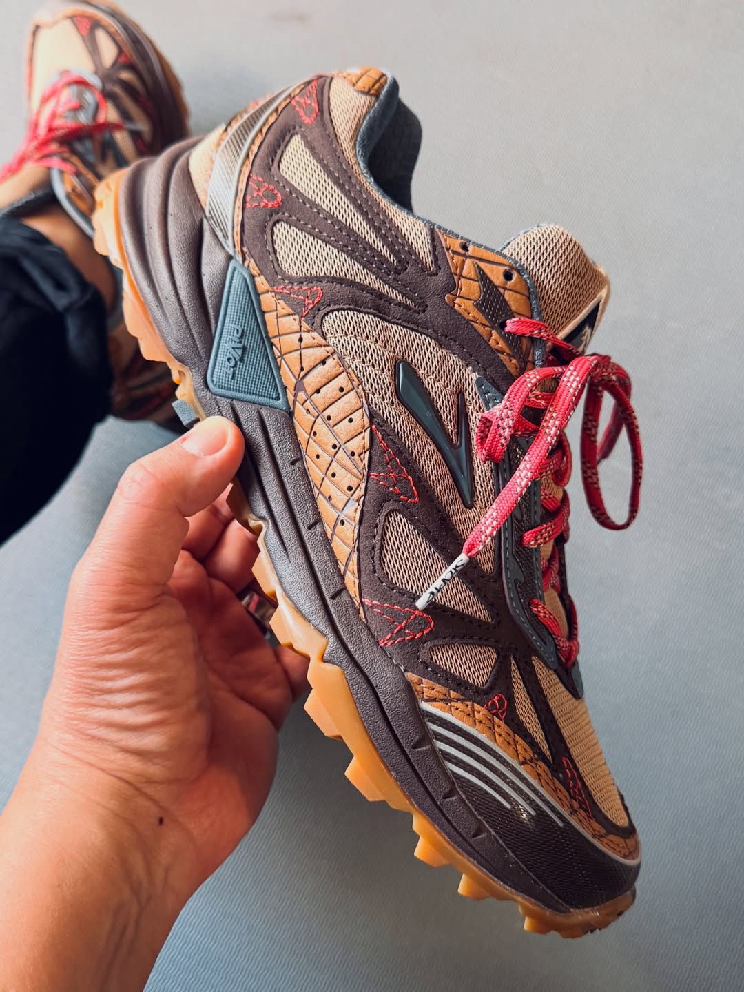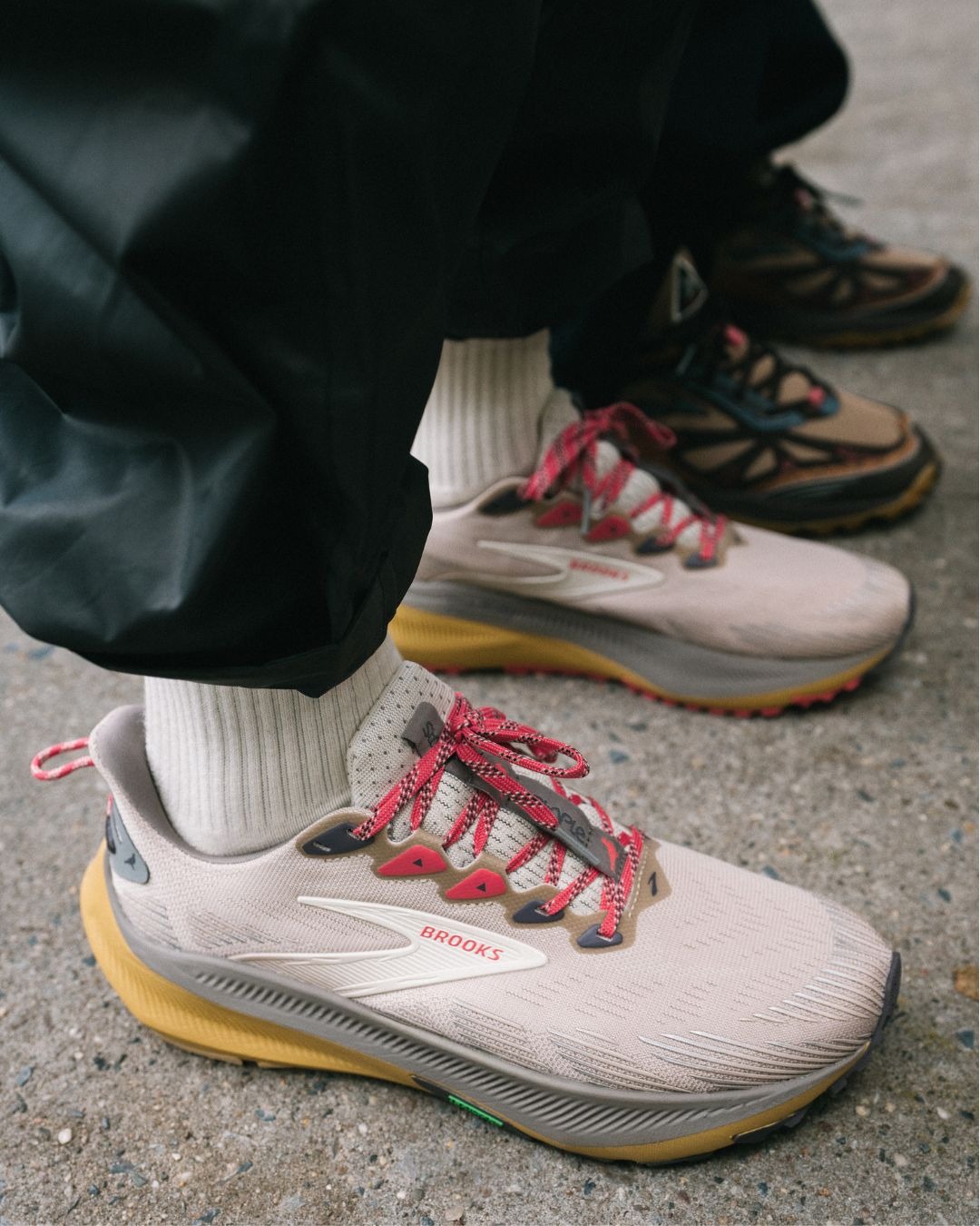 On the other end of the spectrum, the Ghost Trail represents Brooks’ current performance ethos. Built with a streamlined, one-piece mesh upper in tan, the silhouette features a thick, cushioned midsole split between grey and light brown for visual depth. Red laces and a heel pull tab unify the pack, while the overall construction prioritizes comfort, durability, and everyday wearability, whether on the trail or the pavement.