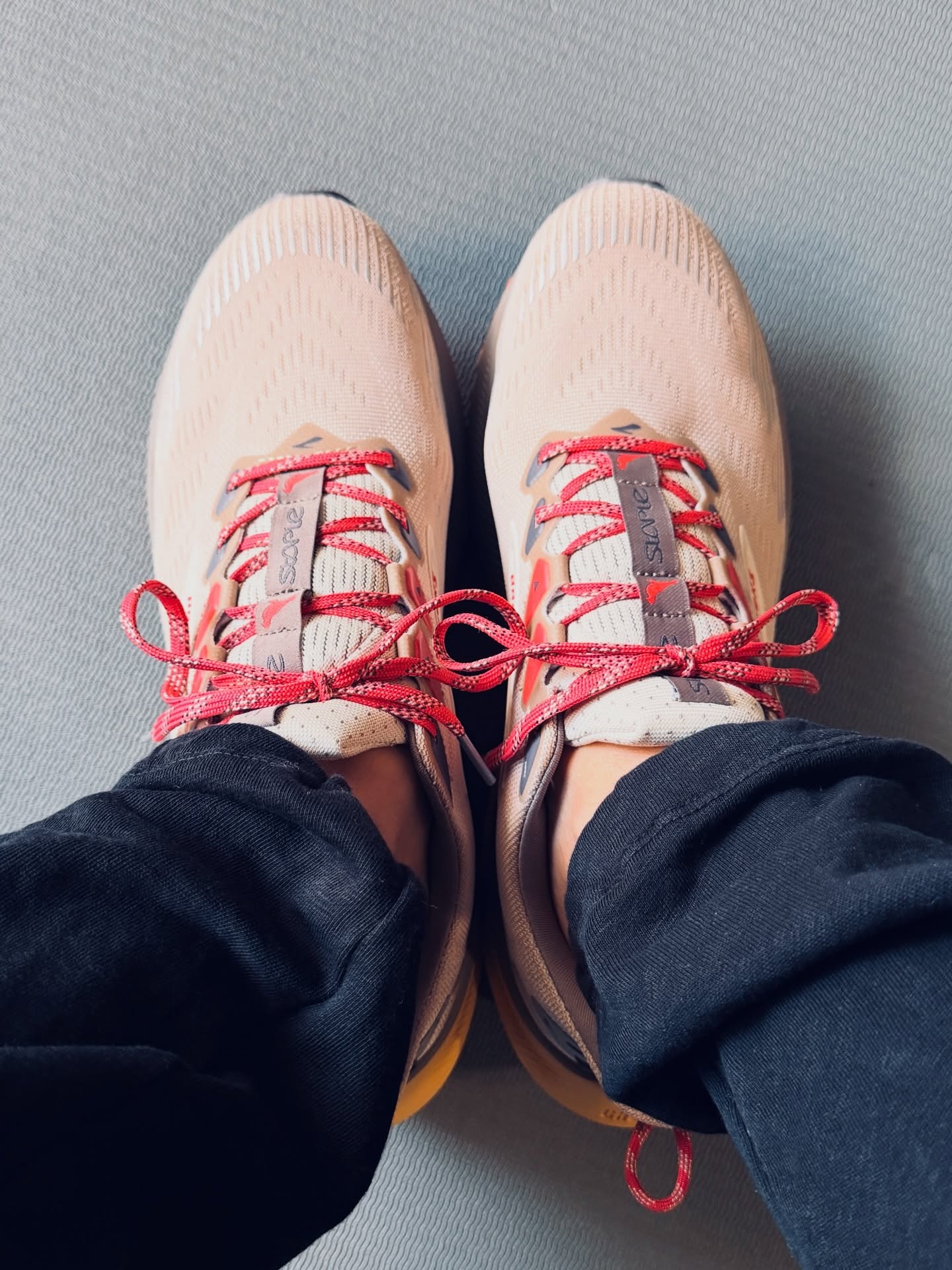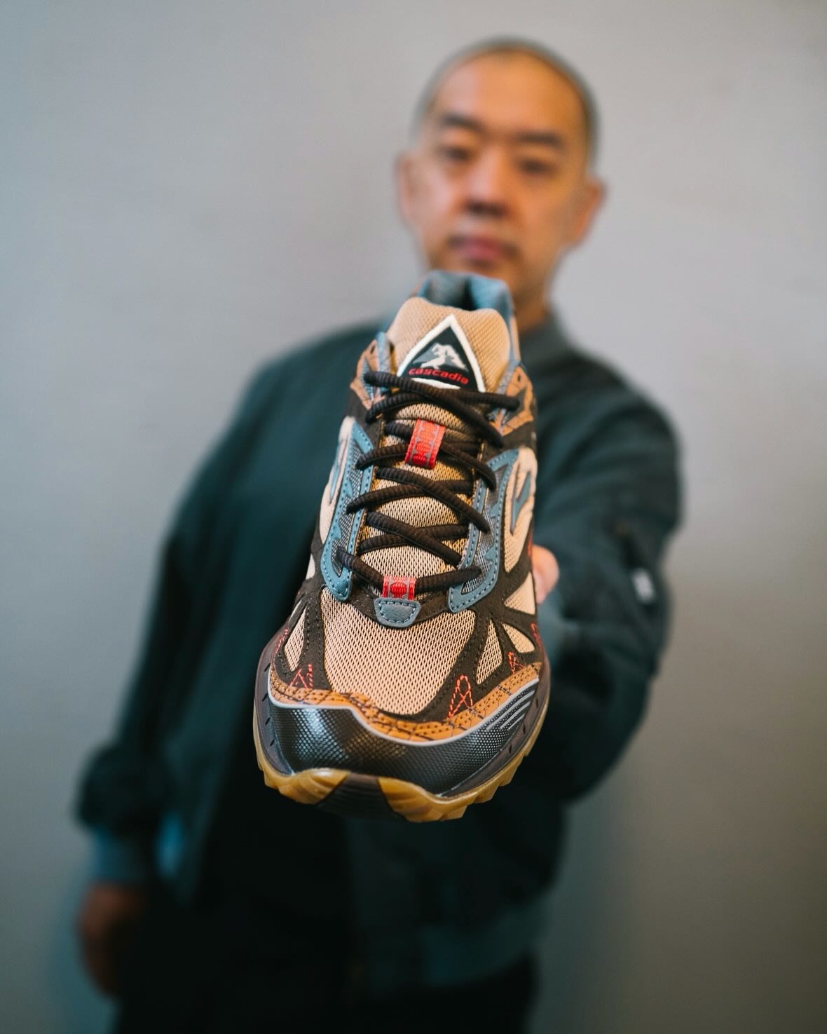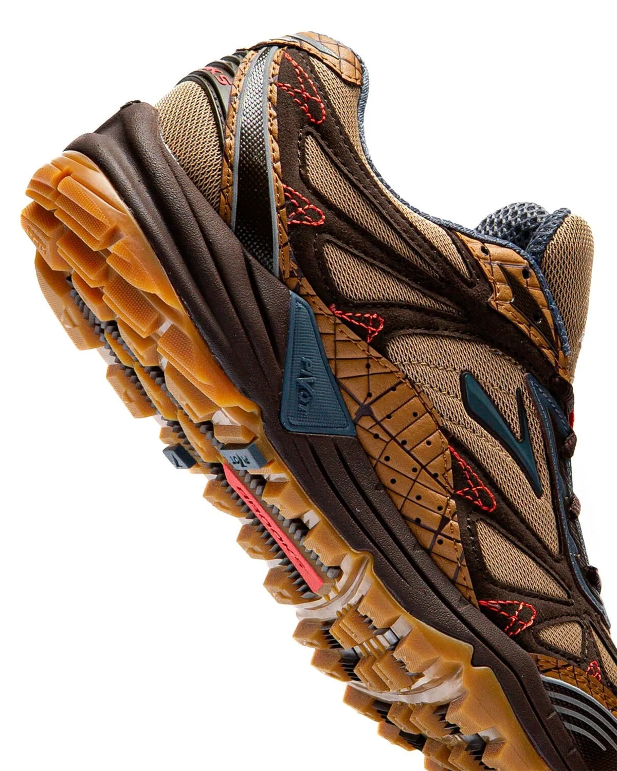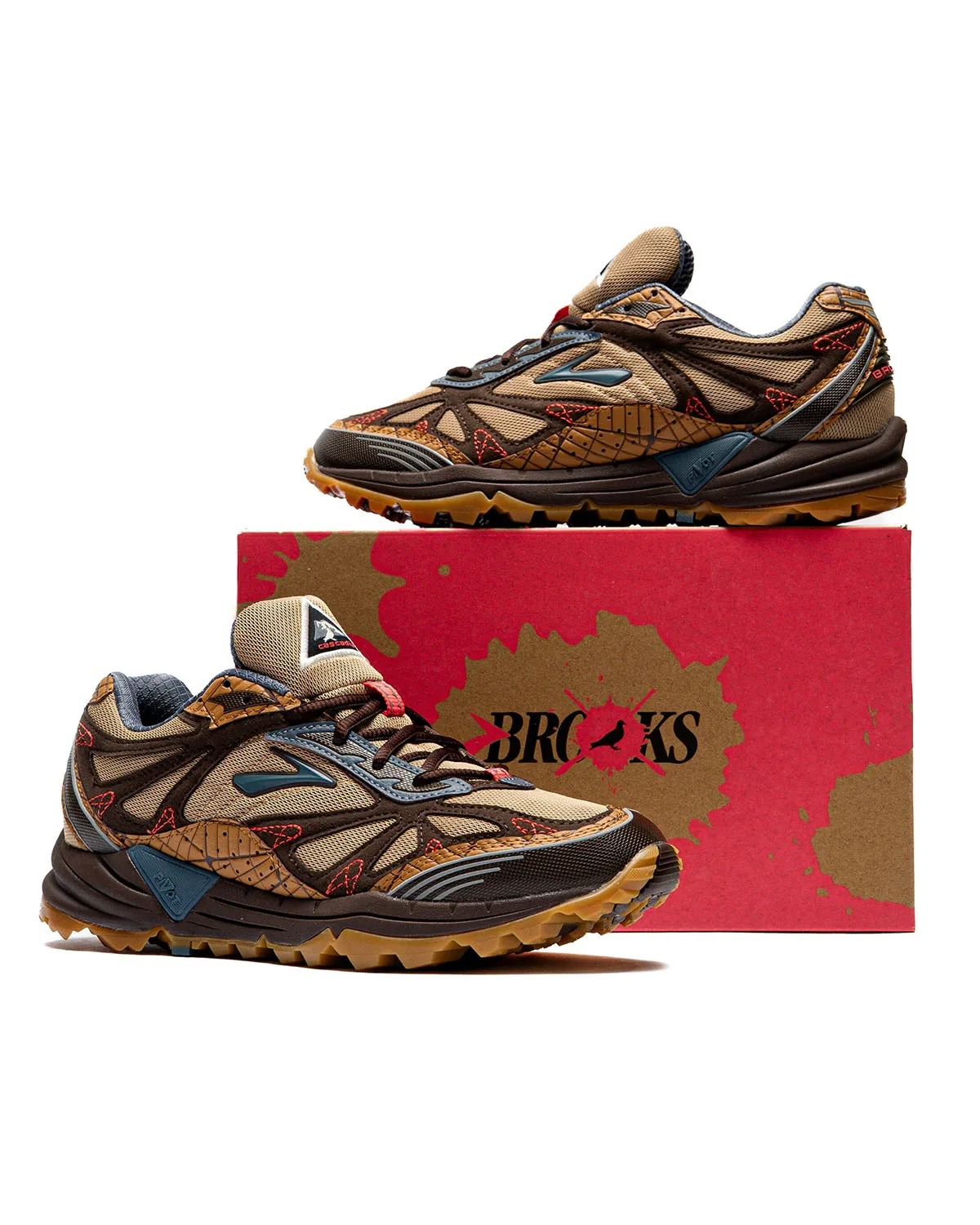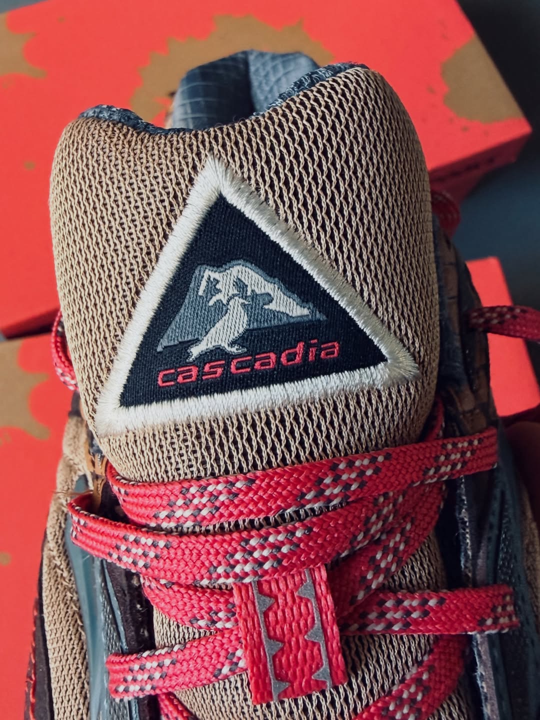 The Cascadia 1 leans into nostalgia with a few twists. It features light brown mesh with darker suede overlays and textured leather panels along the midsole, heel, and collar. Pops of crimson red appear throughout the laces and stitching, adding contrast to the neutral base. Underfoot, a gum outsole reinforces the archival feel while remaining trail-appropriate.