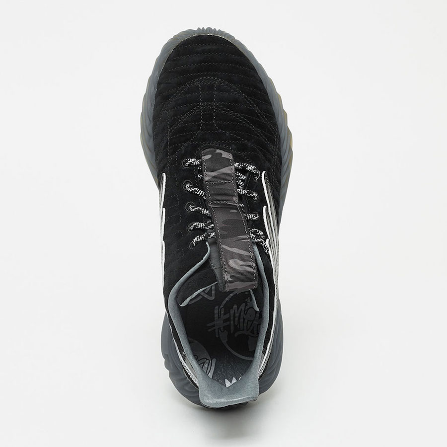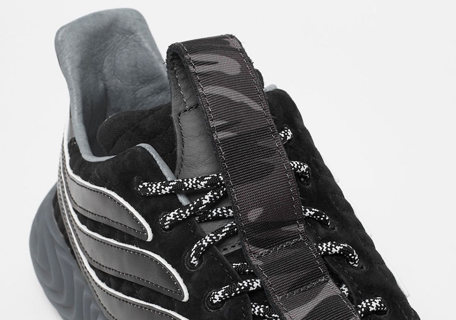The shoe is decked out with a complete black suede upper and white to black gradient three stripes along the side and matching black and white laces. It also has a black and grey camo print back panel and tongue tab. A black translucent outsole sports a graphic print under the shoe.