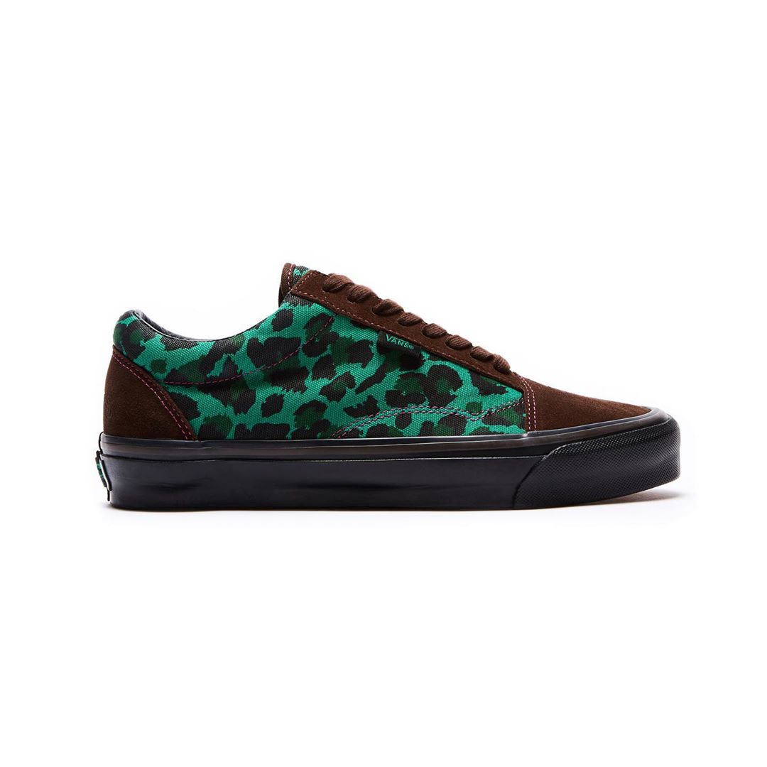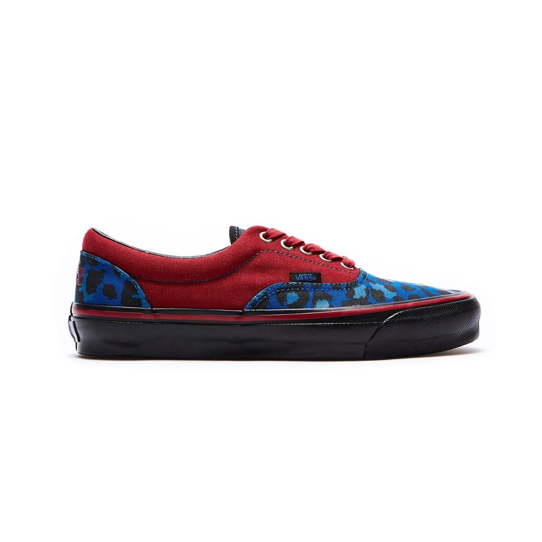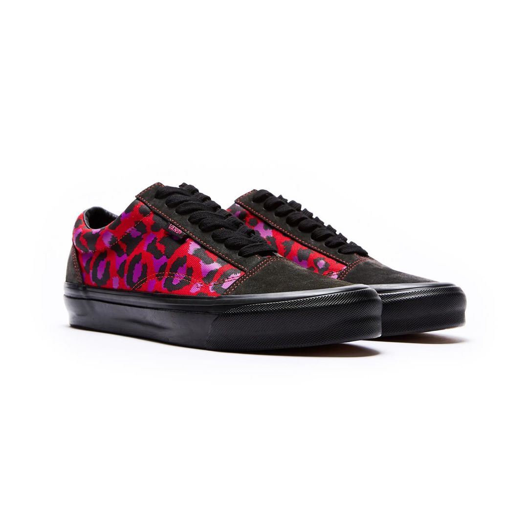 The collection includes two colorways of the Vans Old Skool No Stripe, a modified version of the classic Old Skool that omits the stripe normally found on its side panels. Dressed in Brown/Green and Black/Red, both feature canvas and suede construction and come covered in a punk-inspired leopard pattern. The third shoe, an Era comes in Maroon/Blue, features the same leopard-print, though the pattern-blocking on this pair is reversed from the other two. All three feature an embossed Stray Rats logo on the back heel.