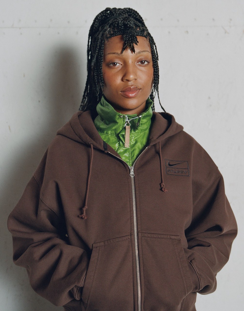 The footwear is accompanied by an apparel offering that fuses technical utility and elevated streetwear style, featuring high-loft zip-up jackets in khaki and black colorways, surplus-inspired hooded utility jackets crafted from water-repellant fabrics, black and neon thermal pullovers, and utility pants with side zippers that open to reveal mesh gussets for added airflow. The lineup also includes a restock of co-branded sweats in black, grey, seen in previous Stüssy x Nike drops.