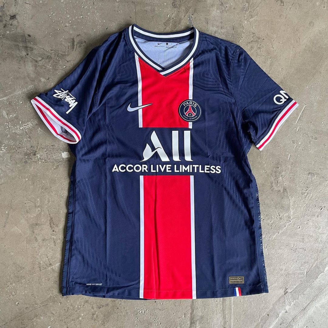 Individuals close to the brand have revealed a version of the Nike PSG Hechter jersey adorned with Stüssy’s signature branding. The iconic Stüssy wordmark appears on the right sleeve, while the back features “Stüssy” in large cursive print, as well as the Double S logo and the address for the new Paris store.