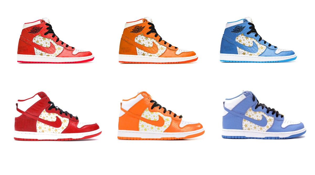 The original Nike SB x Supreme Dunk Highs came in three colorways: Varsity Red, University Blue, and College Orange. They featured croc-leather overlays, gold dubraes, and a gold star pattern on the quarter panel. These Air Jordan 1s are expected to have all of those same features and come in the same three colorways.