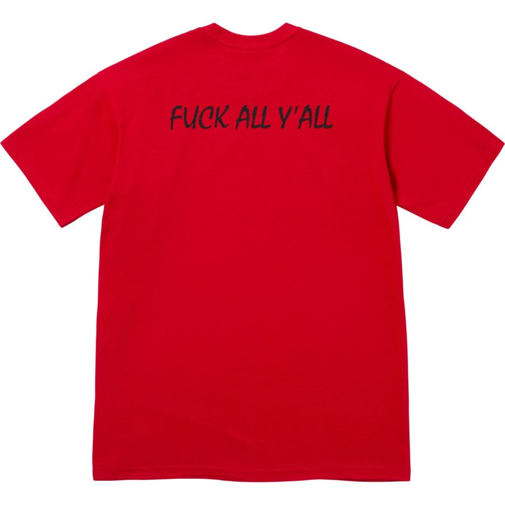 The “Split” tee brings back a piece Supreme originally released in 2008, flipping Ice Cube’s logo across the chest with the lyrics “Fuck All Y’all” printed on the back in N.W.A.-style typography. The quote comes from Ice Cube’s 1991 diss track “No Vaseline,” recorded after his split from the group.