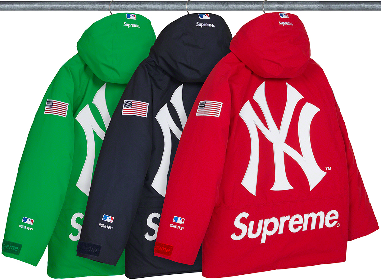 As expected, there is also a ton of collaborations. We see a range of Skittles items, including Supreme-branded packs of candy and cycling apparel and accessories made with Castelli. There are jackets made in collaboration with Schott, Mitchell & Ness, and Alpha Industries. We see pieces featuring artwork from NY-based graffiti artists Stash and Lady Pink, as well as from Japanese artist Tadanori Yokoo. A range of New York Yankees pieces are previewed, such as GORE-TEX jackets, New Era fitteds, and airbrushed hoodies, tees, and skate decks. The Supreme x Nike Air Force 1 also returns in a wheat colorway, joining the black and white colorways introduced a couple seasons ago.