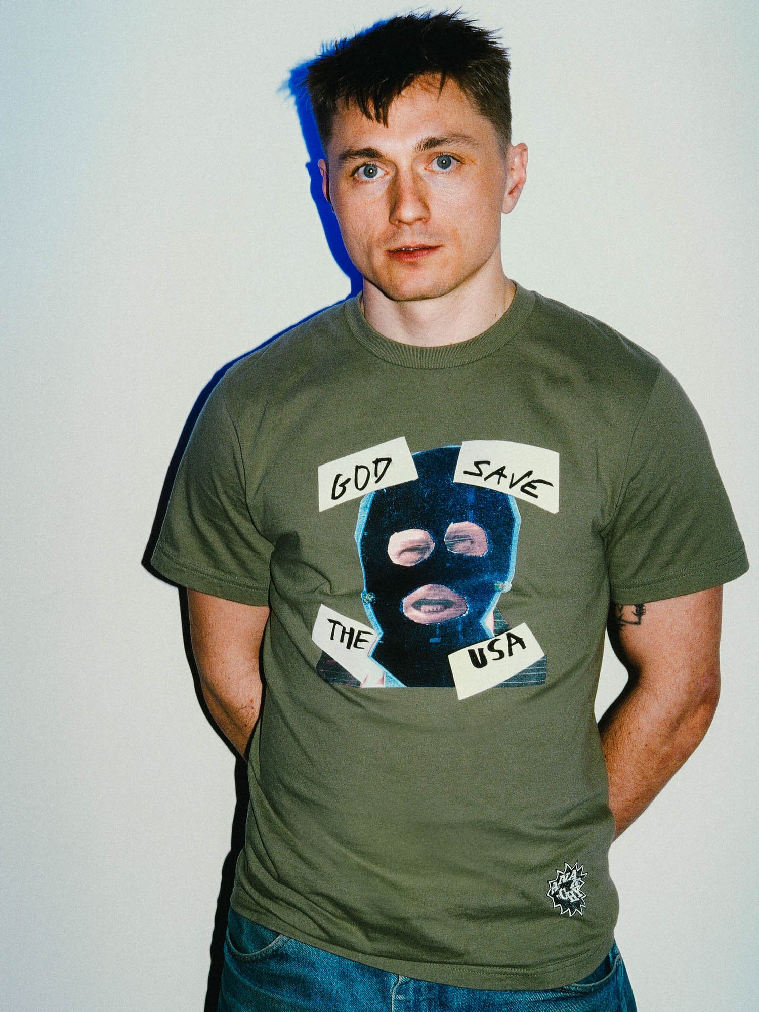 The collection also highlights the work of late English artist Jamie Reid, best known for his cover art for the Sex Pistols single “God Save the Queen,” widely regarded as one of the most iconic images of the punk era. The God Save Us Tee features a ski-masked figure alongside “GOD SAVE THE USA” rendered in Reid’s signature ransom-note cutout style, offering a design that feels especially timely within today’s political landscape.