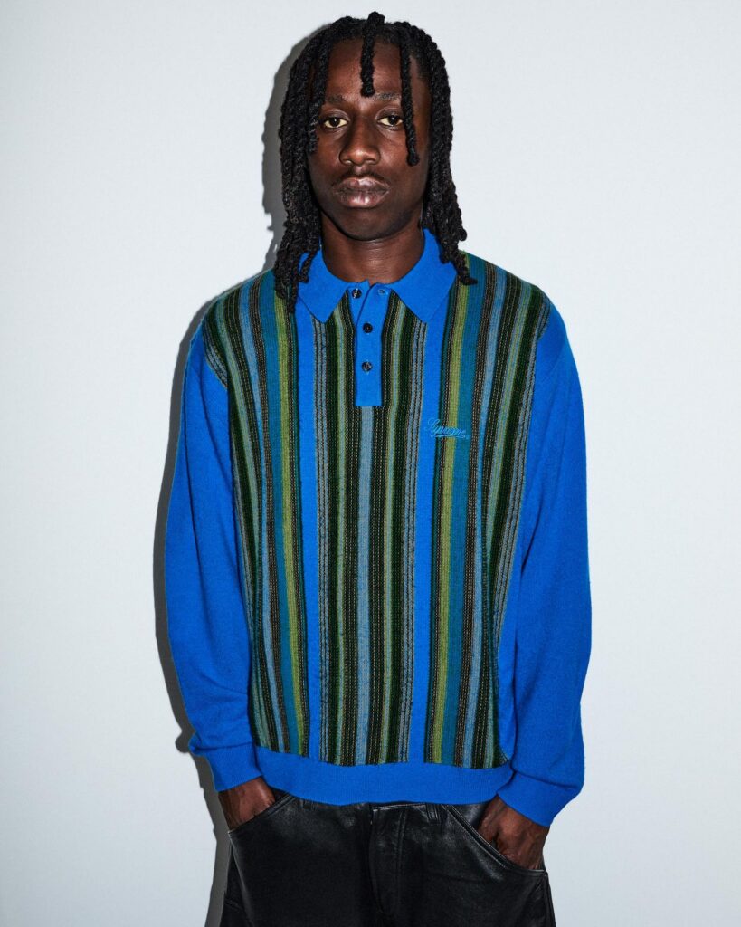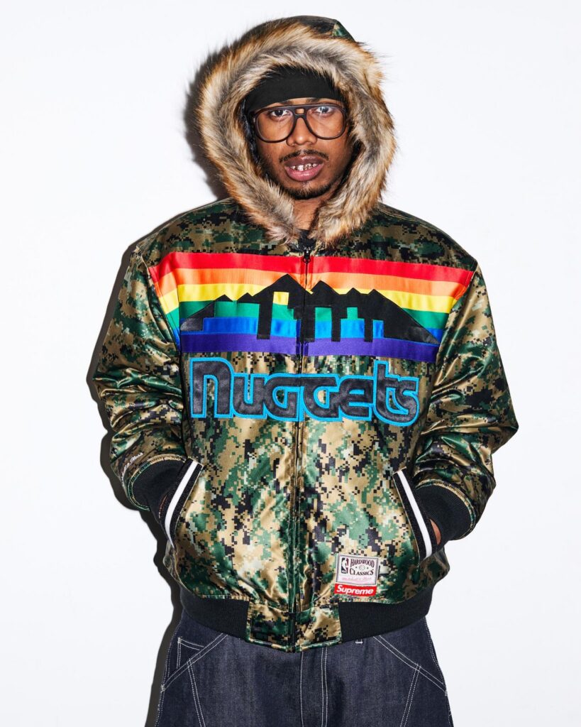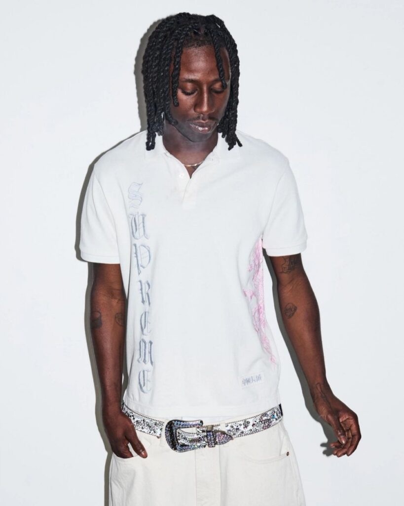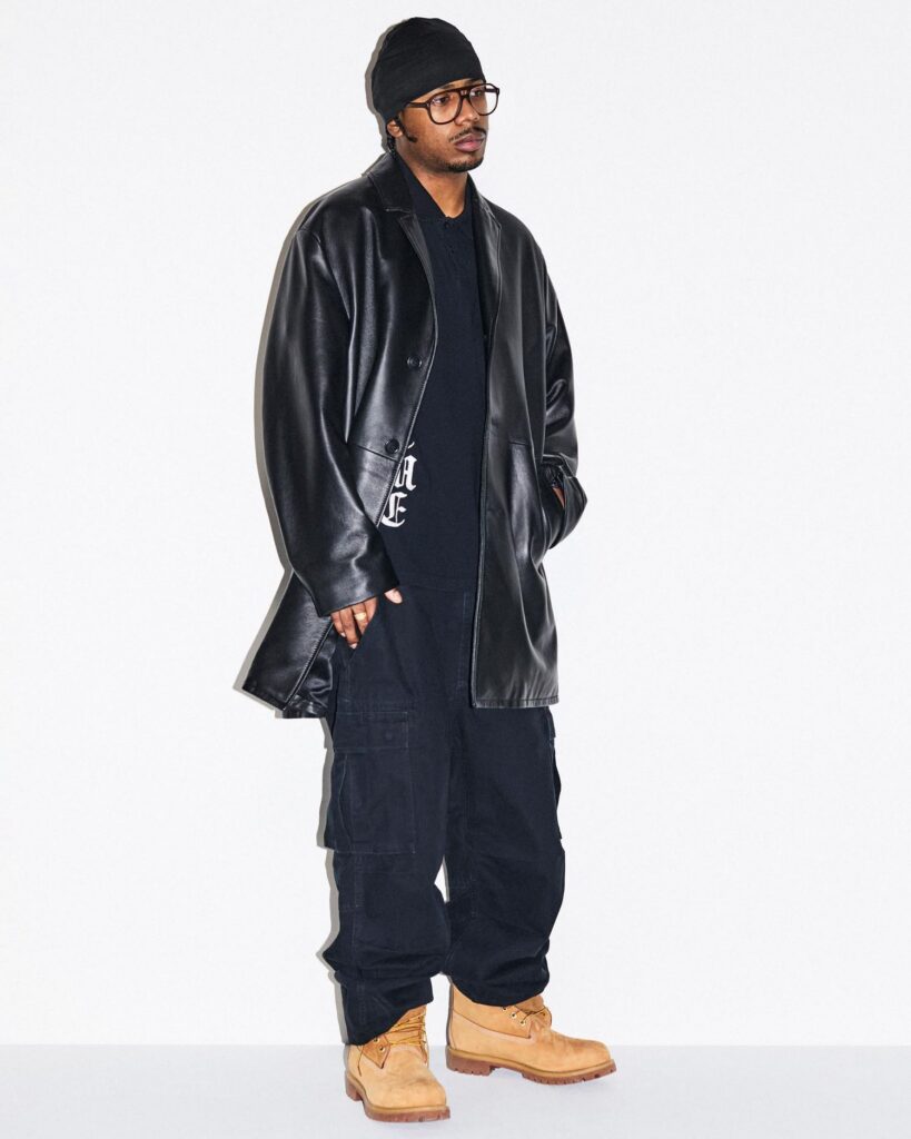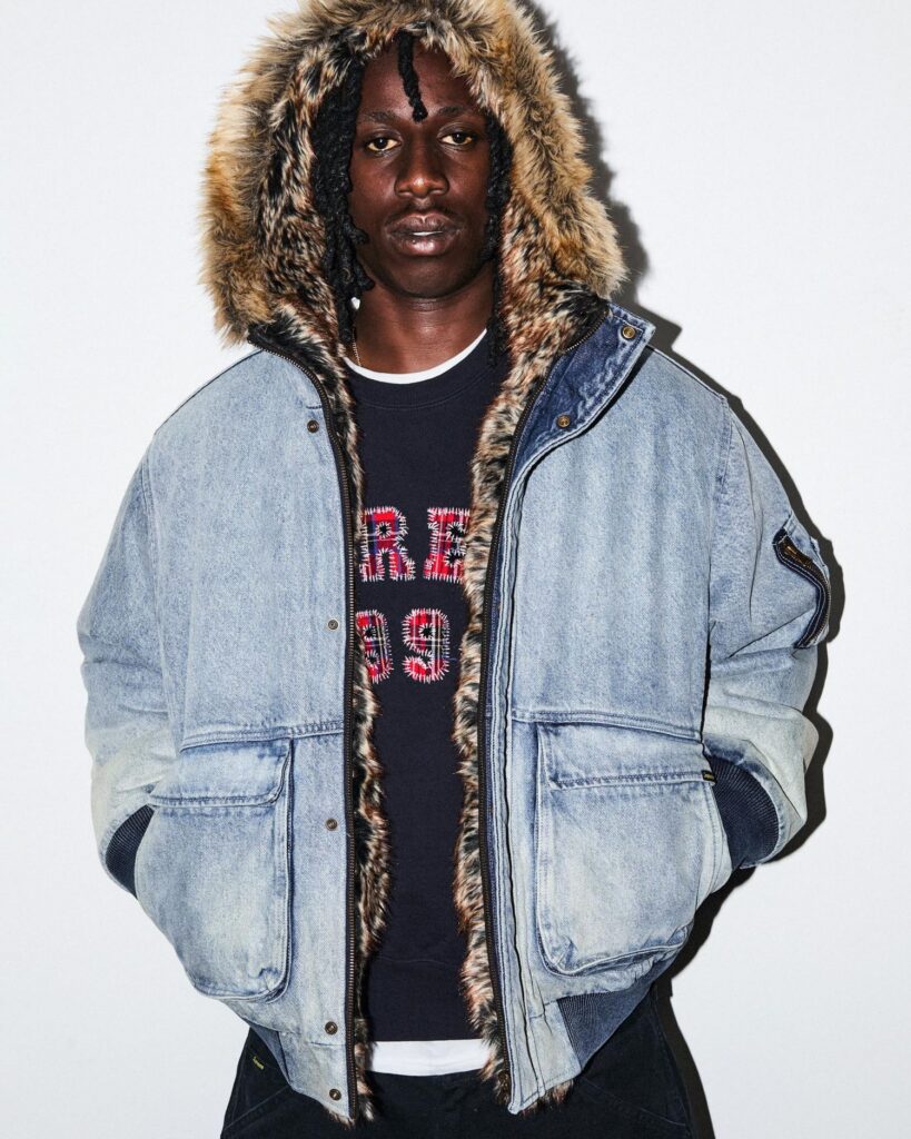 Check out the full Supreme SS26 lookbook below. Standout pieces include the Dipset-coded USA flag work jacket, the rugby in collaboration with La Martina and Jacob & Co., the Sea Island cotton suit, the reversible faux fur/denim hooded work jacket, and the Arabic logo hoodie. Also, peep the “ICE OUT” pin easter egg on the Misfits jacket.