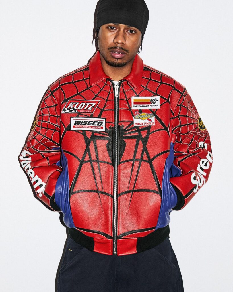 There’s some crazy collabs this season, but we must start by talking about the Spider-Man pieces. Marvel’s friendly neighborhood web-crawler steals the show with his own Vanson Leathers jacket, offered in full-color red and blue as well as in all-black, alongside matching cowhide leather shorts. Other Spidey pieces by Vanson include an acrylic sweater with an all-over spiderweb design, zip-up hoodies, mesh back 6-panel hats, and bandanas. We’re also getting Spider-Man x Hanes pieces this season, including tagless tees and boxer briefs, each coming in packs of two. Rounding out the capsule is a graphic tee of Spider-Man swinging through the city with a Supreme banner in the background.