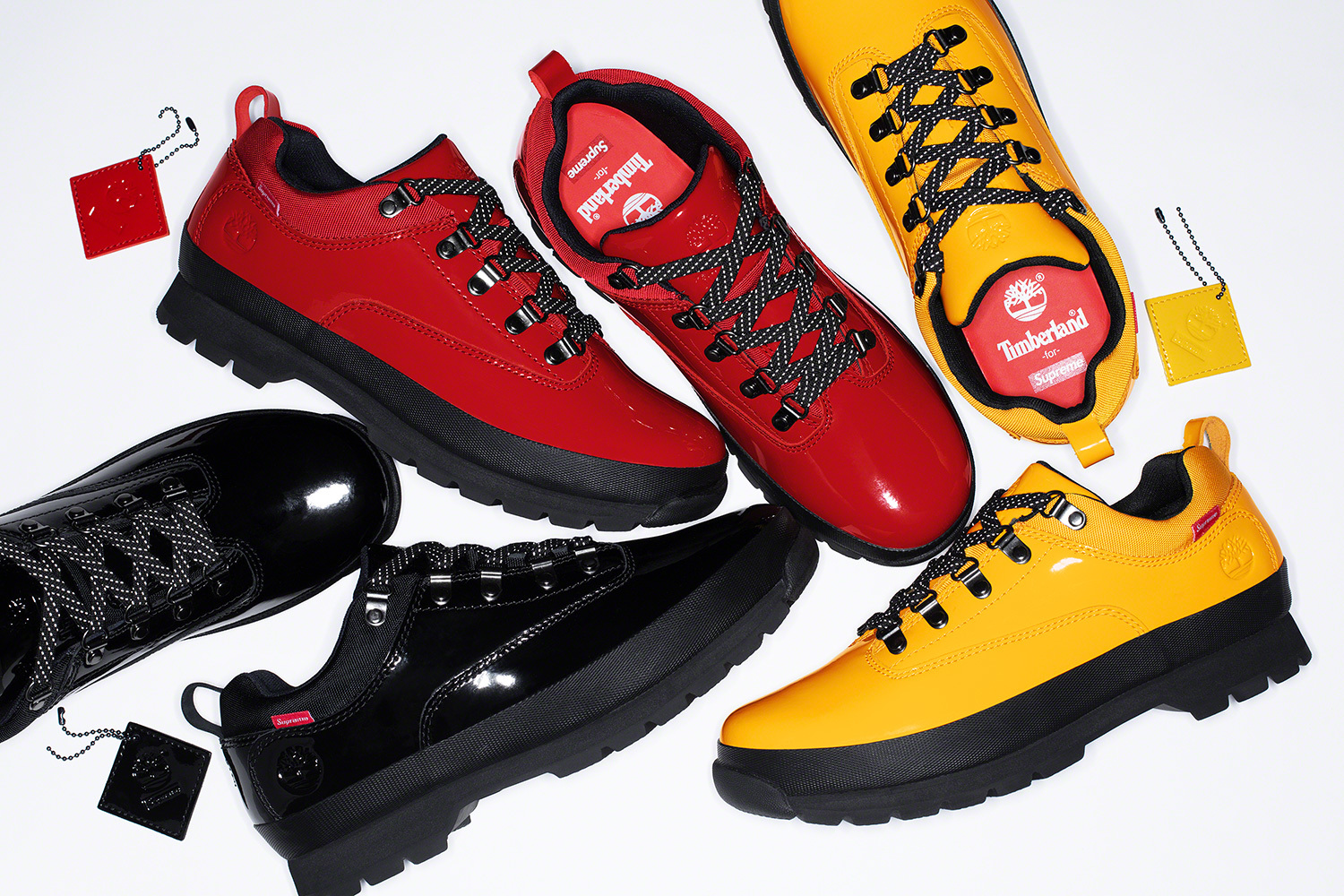 This new collection sees Supreme and Timberland working together to produce three colorways of the Euro Hiker Low. The red, black, and yellow offerings feature patent leather construction with nylon canvas used on the collar. As for branding, Timberland’s tree logo is stamped near the heel, while Supreme branding is limited to the insole and a small sewn-in tab near the collar.